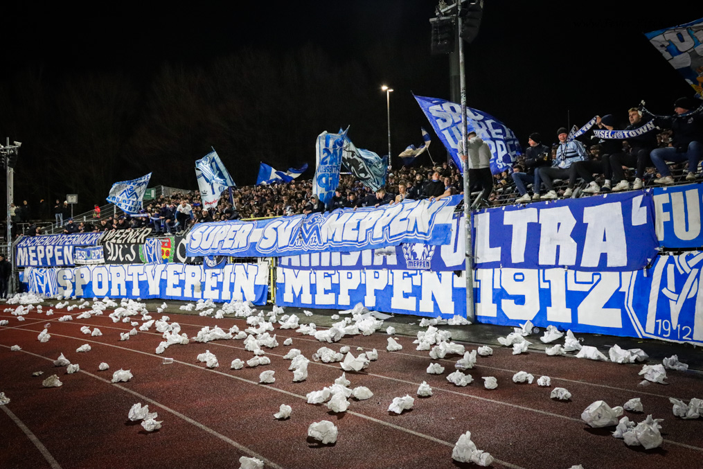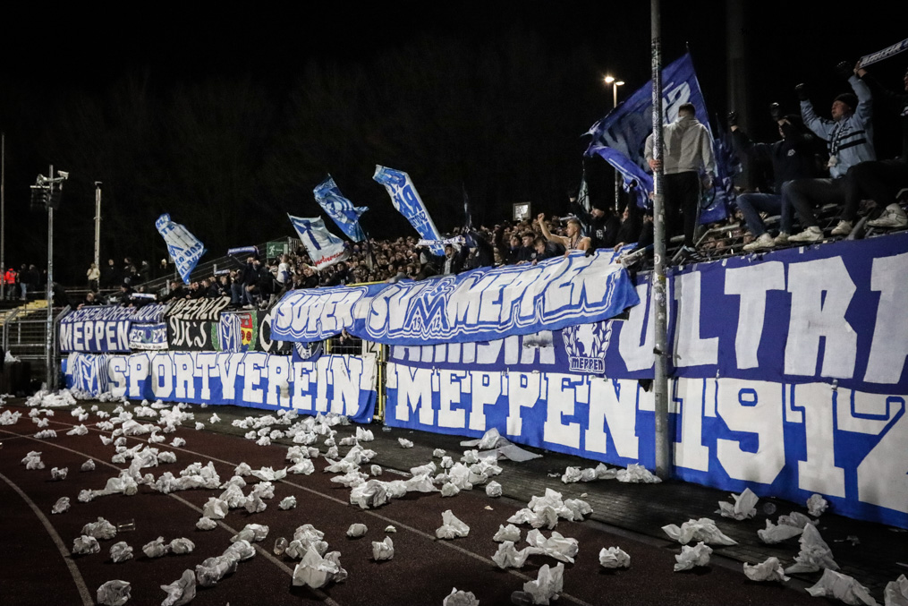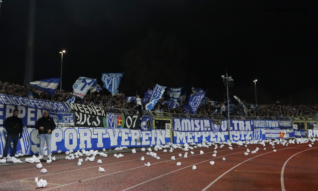 widmen ein Spruchband der kürzlich im Alter von 85 Jaren verstorbenen SV Meppen