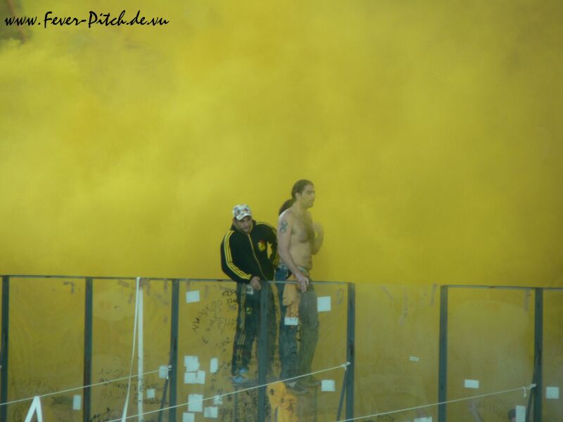 die gesamte Tribüne in dichte gelbe Rauchschwaden gelegt, was schon sehr