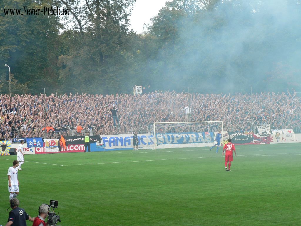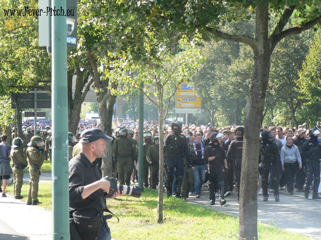 zwischen Bahnhof und Stadion recht imposant zurück. Gesänge, Böller und