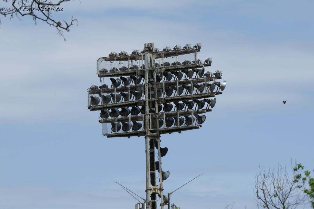 Luftlinie Entfernung vier Flutlichtmasten hinter den Baumwipfeln. Nanu? Wassn