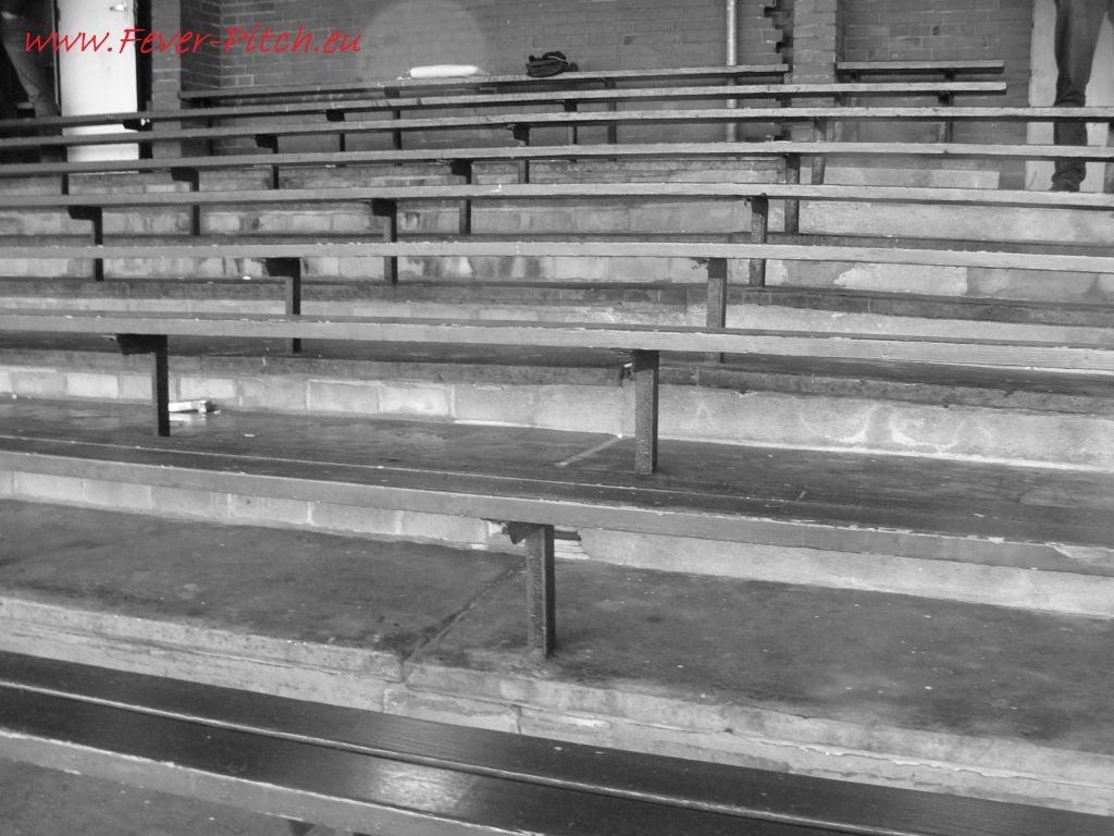 Holzbanktribüne und bemerkenswerten Stehtraversen auf den restlichen drei