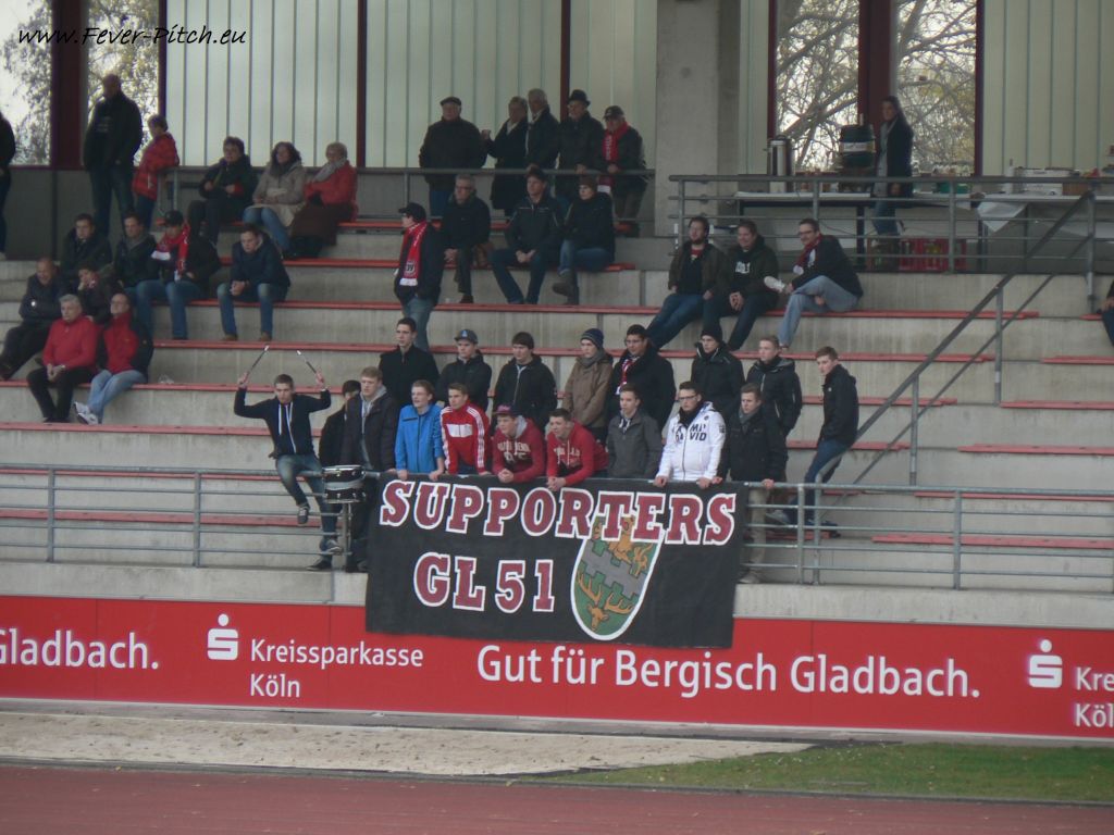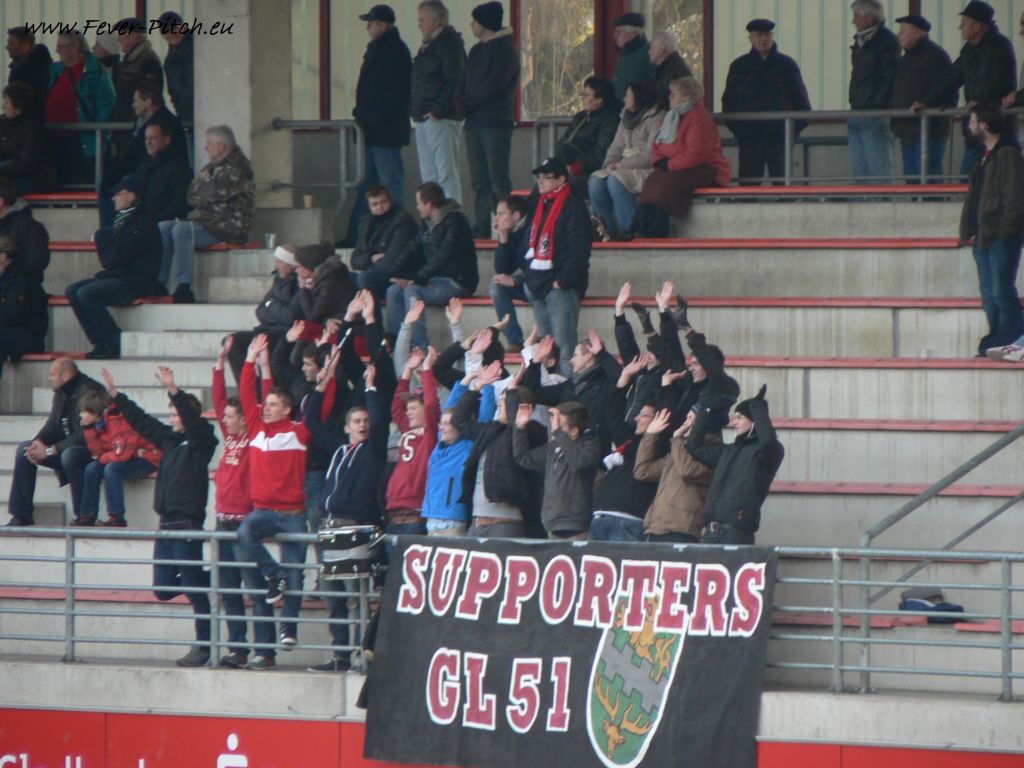 hinter einer „Supporters GL 51“- Fahne auf der überdachten Tribüne einfinden, sind