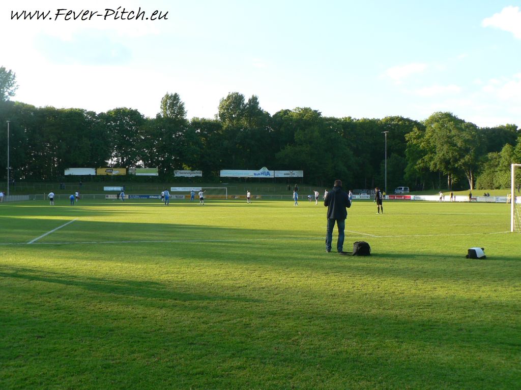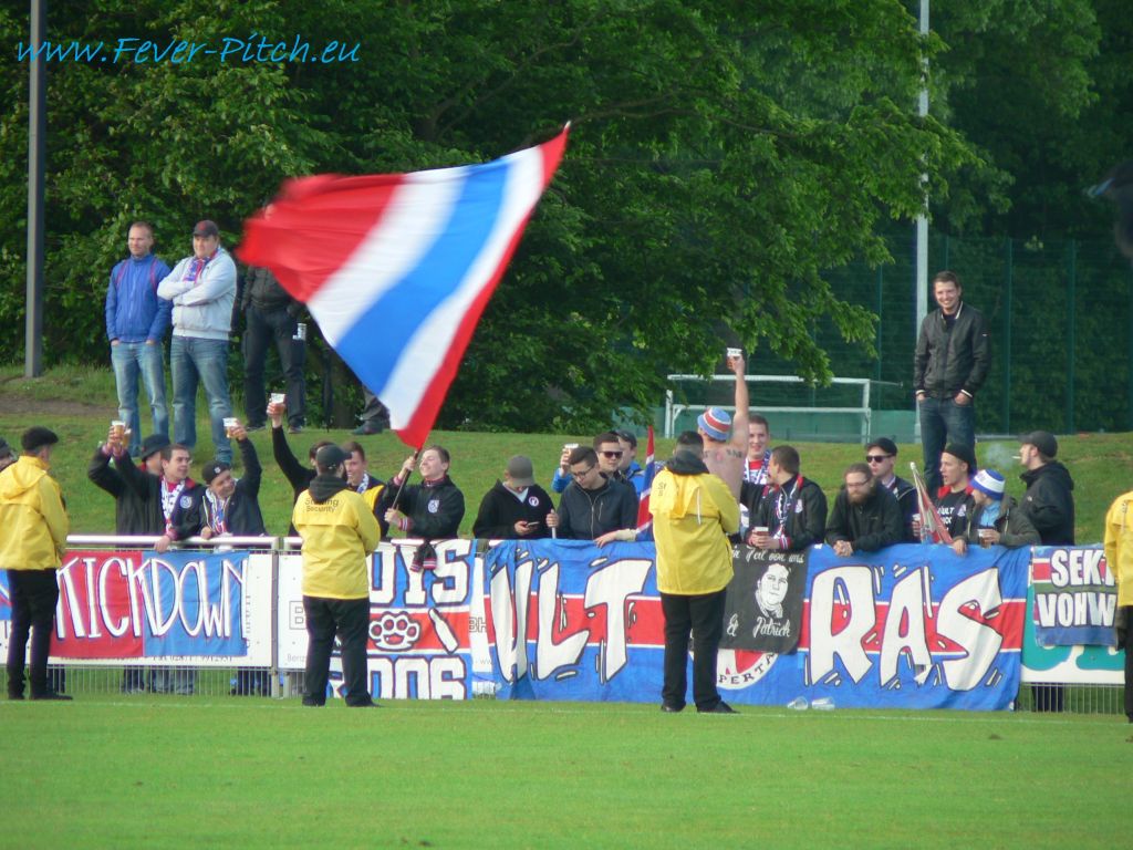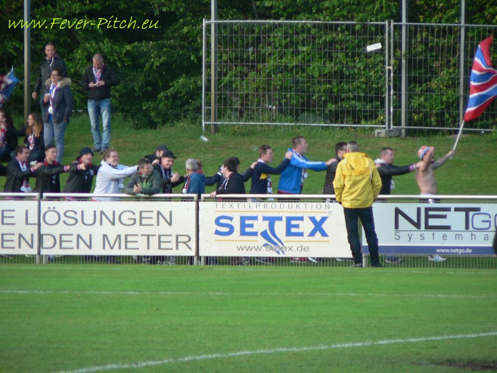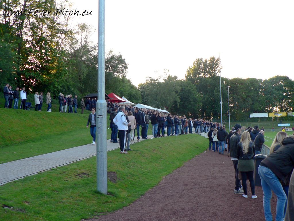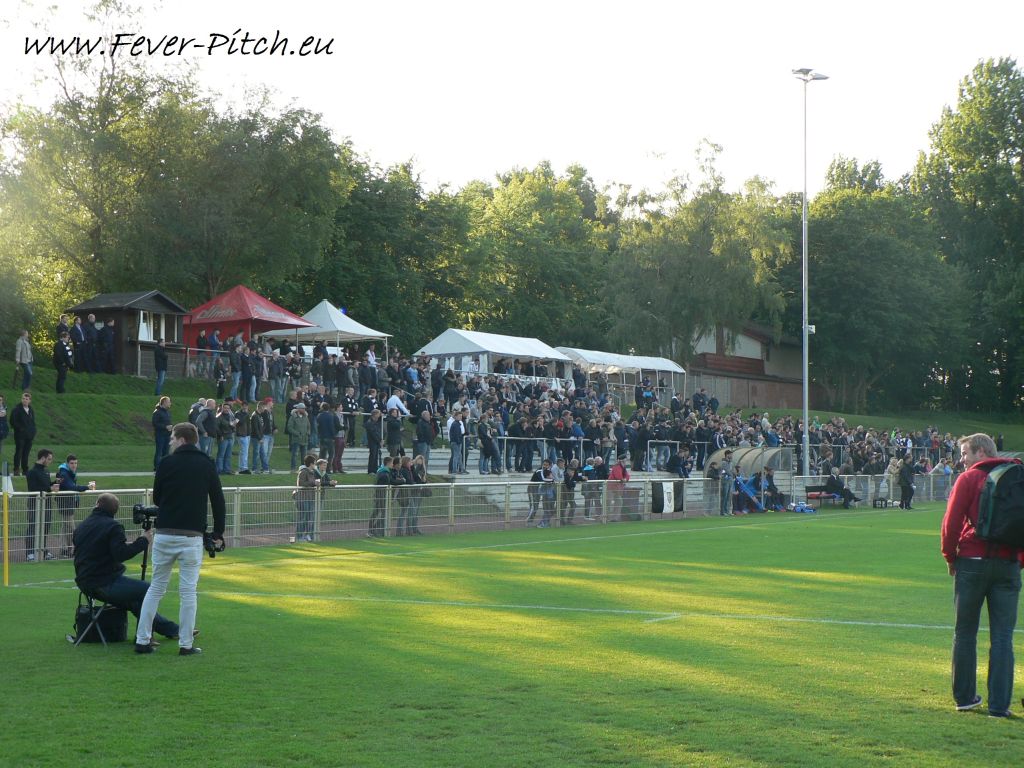 Nun gut, was will man großartig erwarten von Fans, die sich selbst als "Wuppertal asozial" besingen, an einem Mittwochabend beim Kampf um die Ananas in einem eher unspektakulären Stadion? Das Stadion am Hünting verfügte immerhin bis vor gut zwei Jahren noch über eine kleine aber feine überdachte Tribüne, welche aber aus Kostengründen nicht saniert werden konnte und somit abgerissen werden musste. Sehr schade, gibt doch eigentlich eine Tribüne erst immer einem Stadion dessen individuellen Charme. So musste dieses Bauwerk also einigen Betonstufen weichen und ansonsten lassen nur ein paar Wellenbrecher auf den Graswällen hinterm Tor vermuten, dass hier einst sogar Zweitligafußball geboten wurde.