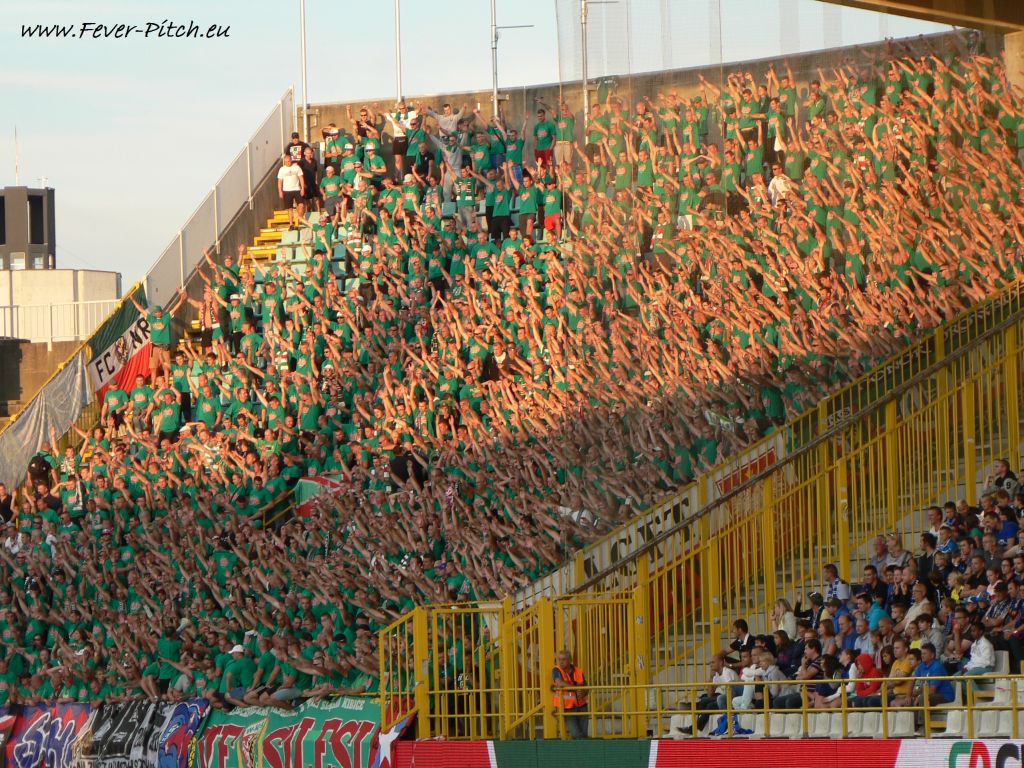 mit nahezu einheitlichen Shirts im nett gelegenen Gästeblock und auch von