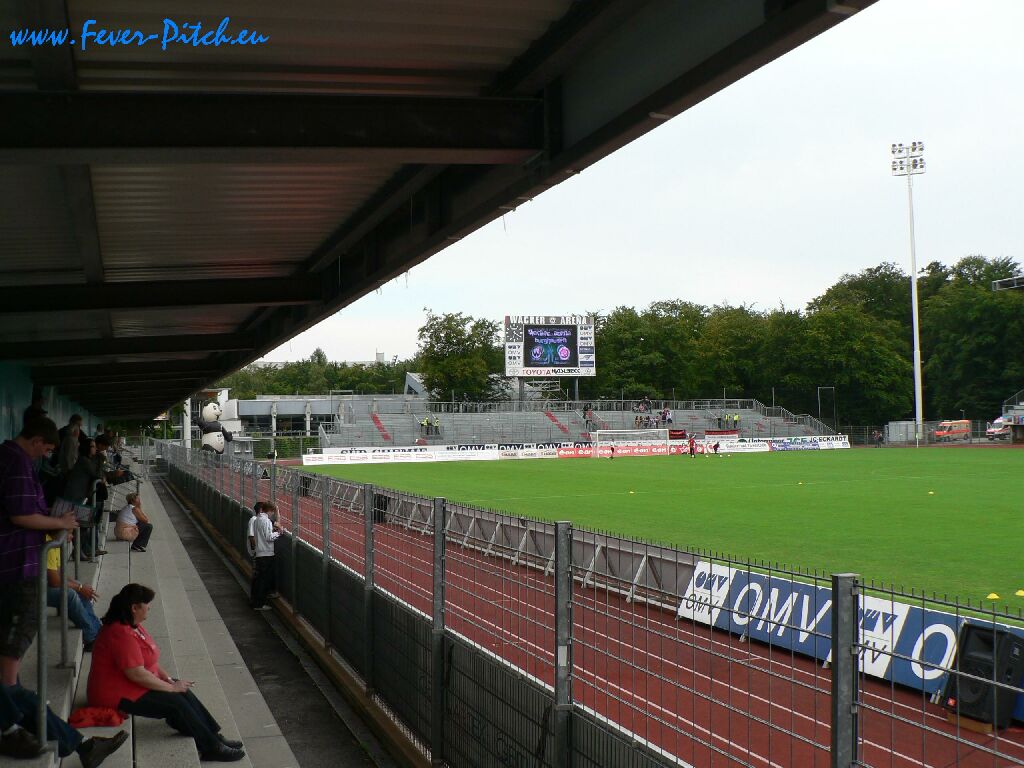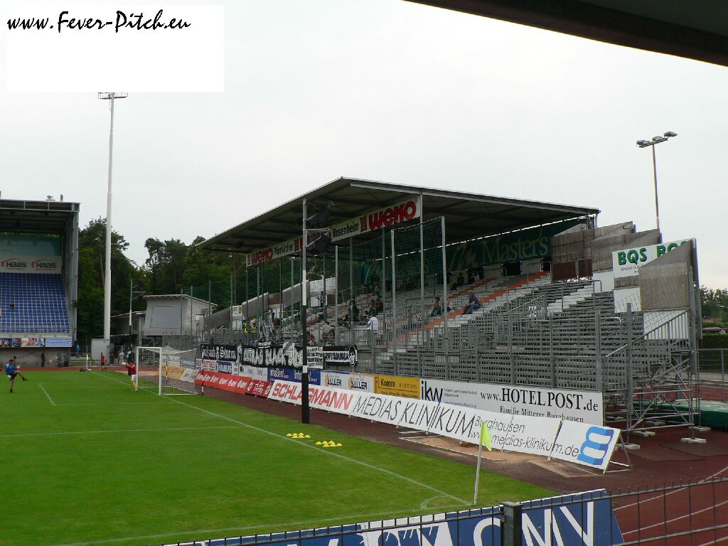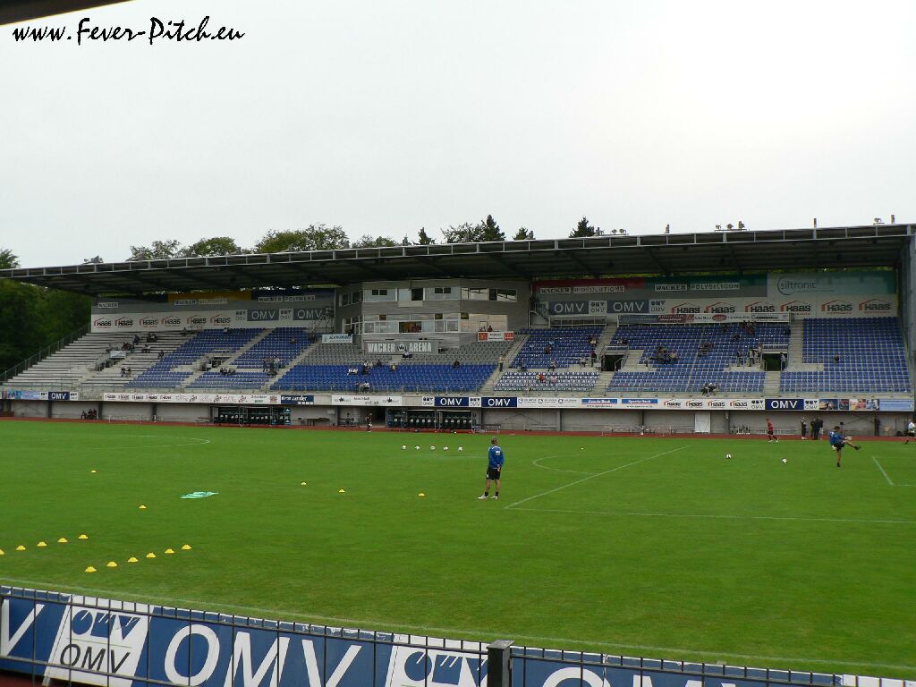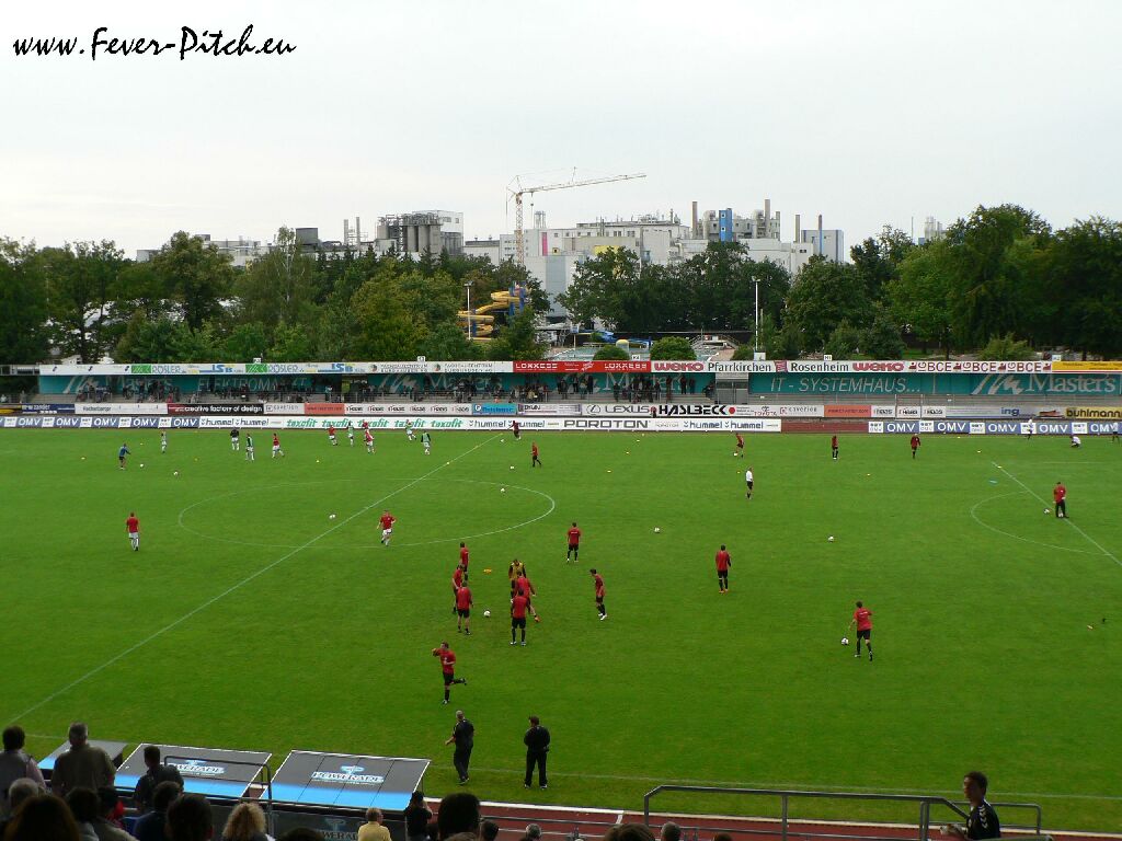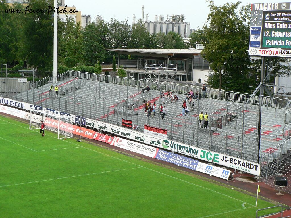 Also herein ins Stadion, welches direkt an ein Freibad und die Wackerwerke grenzt und mal ne Runde gedreht. Die heimischen Ultras verkaufen Mottoshirts fürs Derby gegen Regensburg in drei Tagen und mobilisieren via diverser Plakate. Das Stadion an sich fällt insbesondere durch seine beiden Stahlrohrtribünen hinter den Toren auf, von denen eine als Heimfanblock und die andere als Auswärtsblock dient. Auf den Geraden finden sich die überdachte Haupttribüne und eine kleine überdachte Stehplatztribüne auf der Gegengeraden.