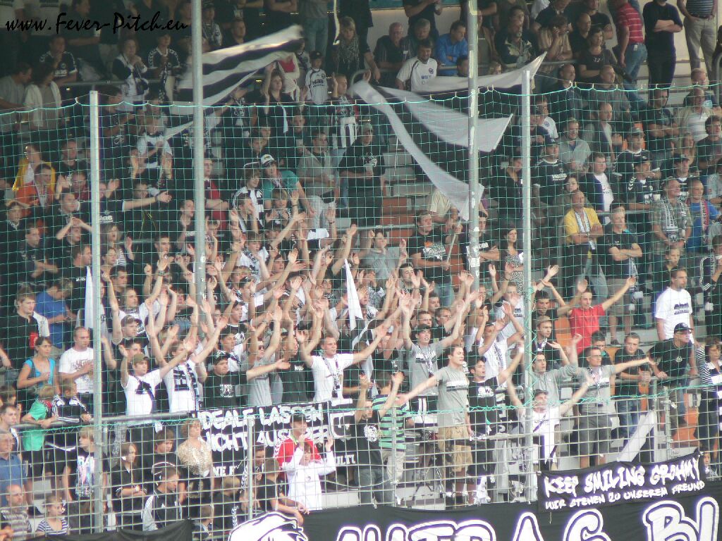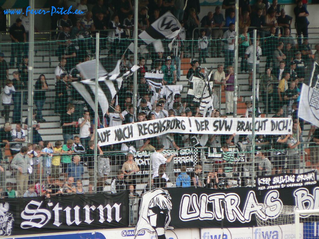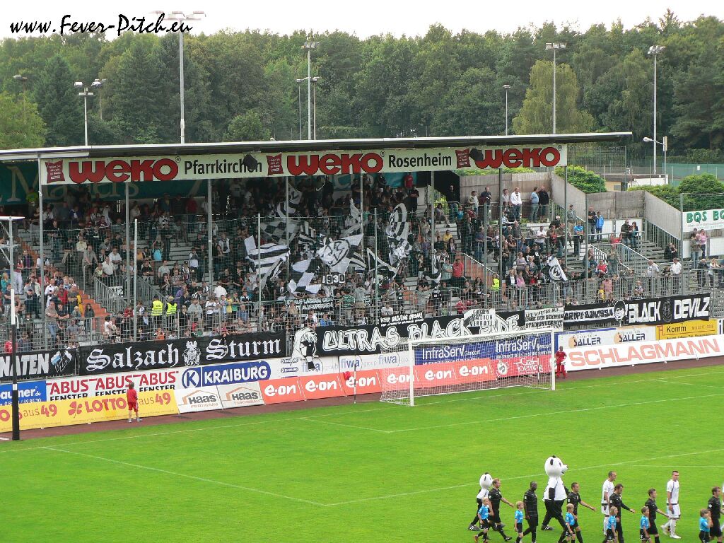 Wacker Burghausen hat glaube ich das Ziel ausgegeben, in den nächsten drei Jahren wieder zweitklassig spielen zu wollen, hat dabei den Start in die neue Saison aber mehr oder weniger verpatzt. Ein Punkt aus den ersten beiden Spielen und auch heute schrammte man gegen den sinnlosen Retortenklub aus der hessischen Landeshauptstadt nur knapp an einer Niederlage vorbei. Begleitet wurde dieser von vielleicht 20 Anhängern, welche lose verteilt im Gästebereich standen und keinen Mucks von sich gaben. Zwar gelten 500 km Anreise auf nem Mittwoch als Argument, trotzdem mir persönlich ein höchst unsympathischer Verein. Weg mit dem, braucht niemand!