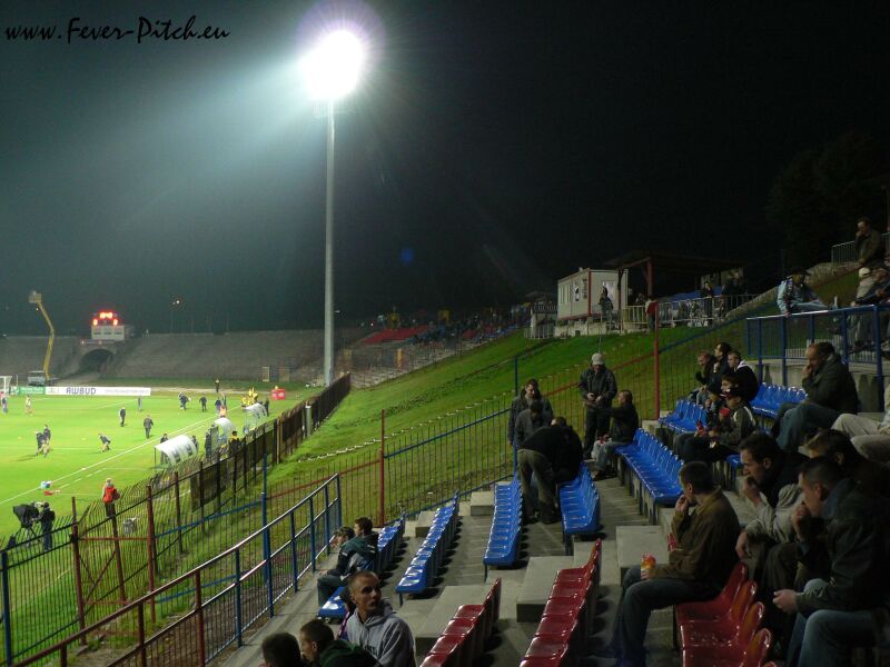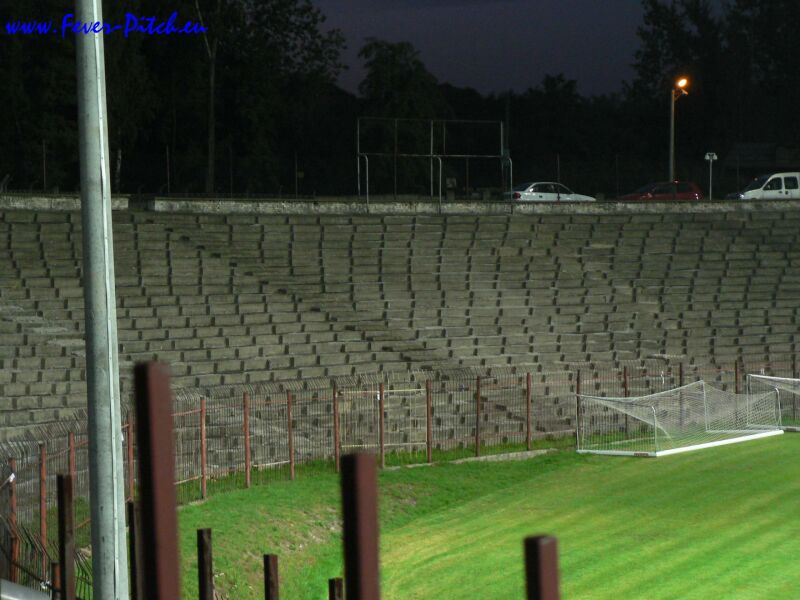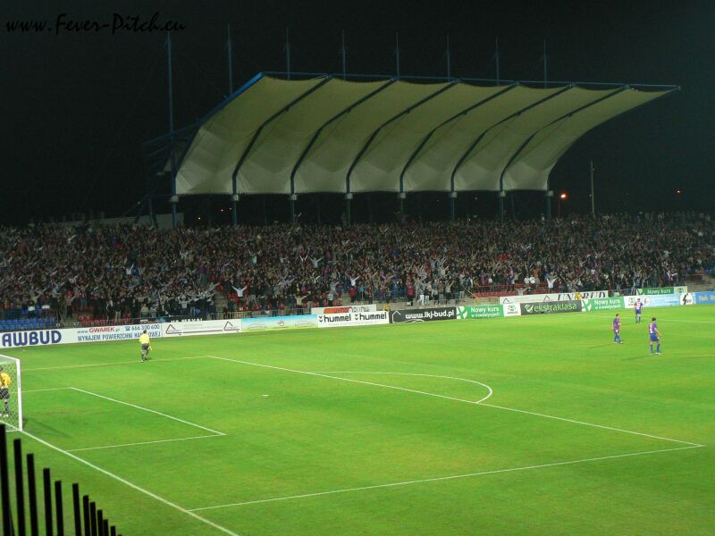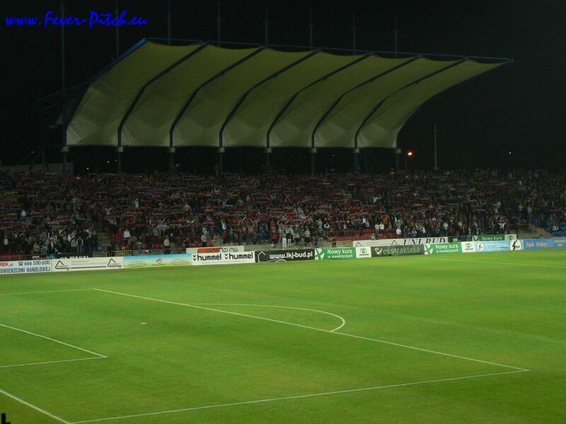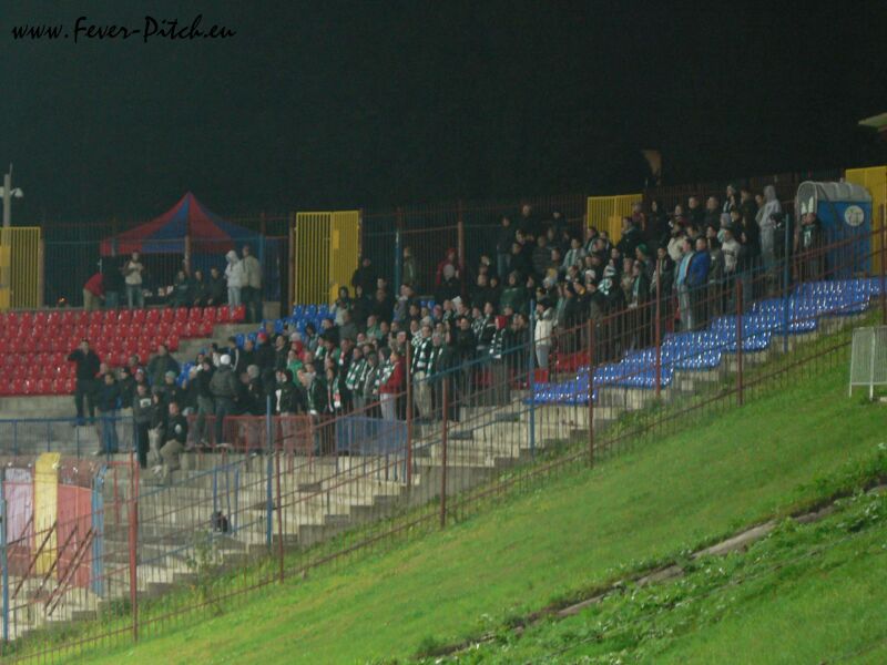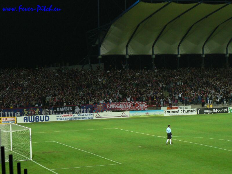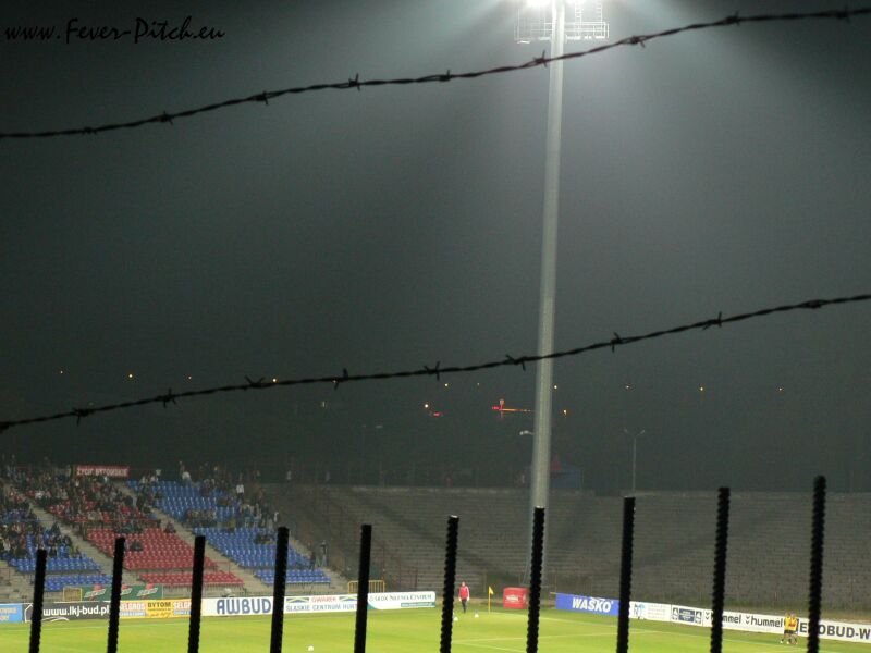 Mit dem Halbzeitpfiff wurde aber auch hier der Heimbereich mit überwiegend sehr, sehr hübschen Zaunfahnen geschmückt und ein megalautes Poooolonia Byyyyytom von der gesamten Haupttribüne in den polnischen Abendhimmel gebrüllt. Schon sehr geil. Vom Support her kam Bytom sehr brachial, also eher wenig melodisch rüber und auch die Abwechslung war jetzt nicht so gegeben, insgesamt aber trotzdem gut, besonders weil man den Kontrast zu Halbzeit eins deutlich sah. Im Gästebereich gab man ebenfalls ein ganz kompaktes Bild ab, konnte sich aber akustisch nur selten bemerkbar machen.
