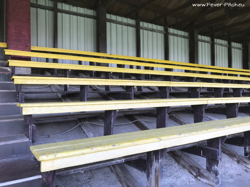 in Vereinsfarben lackierten Sitzflächen und es riecht förmlich nach Holz und
