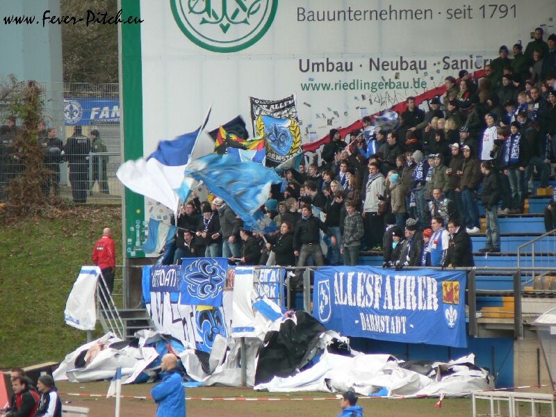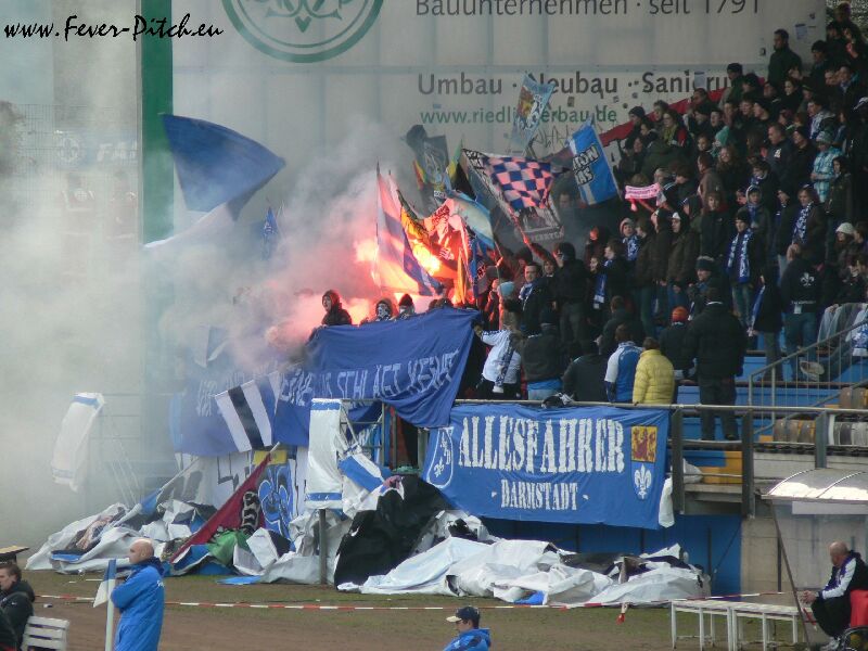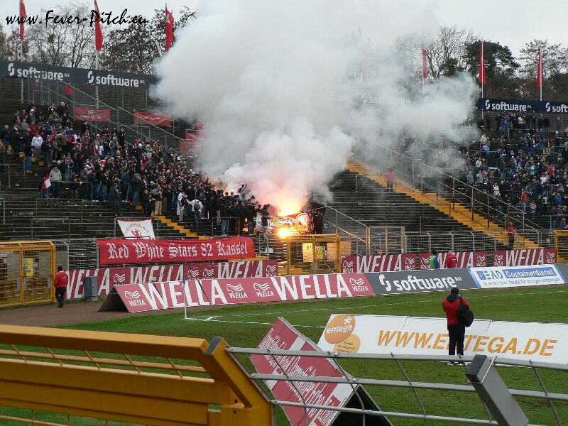 Kassel war mit ca. 600 Leuten angereist, wovon der ultraorientierte Teil eng im Block stand. Apropos Ultras in Kassel. Hatte vor Jahren mal irgendwo gelesen, dass man lt. eigener Aussage sowas wie Ultras nicht bräuchte. Naja, hatte dementsprechend Kassels Fanszene bislang auch stark der traditionellen Richtung zugeordnet (was in großen Teilen nach wie vor so ist) aber auch hier hat sich in den letzten Jahren eine kleine junge Szene entwickelt (Scena Chassalla). Diese bot zu Anpfiff eine recht stattliche Portion Pyro, während Ultras Darmstadt und Umfeld auf der gegenüberliegenden Tribüne eine Choreo aus von unten nach oben gezogenen Bahnen und nem "Sportverein Darmstadt" vorne am Zaun zeigten. Aus meinem spitzen Blickwinkel konnte ich aber nicht wirklich erkennen, was gezeigt werden sollte und hab es zugegebenermaßen auch bis jetzt noch nicht ganz entschlüsseln können. Irgendwie ein wenig komisch gemalt das Ganze.