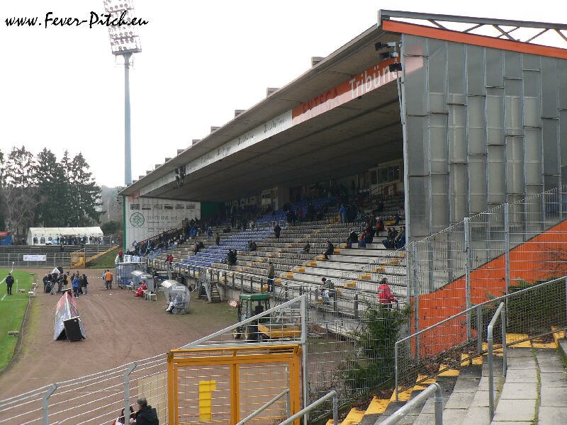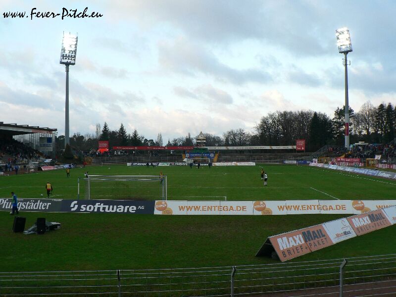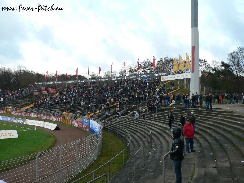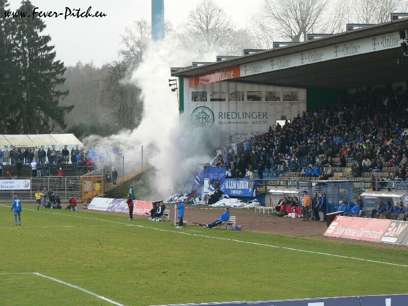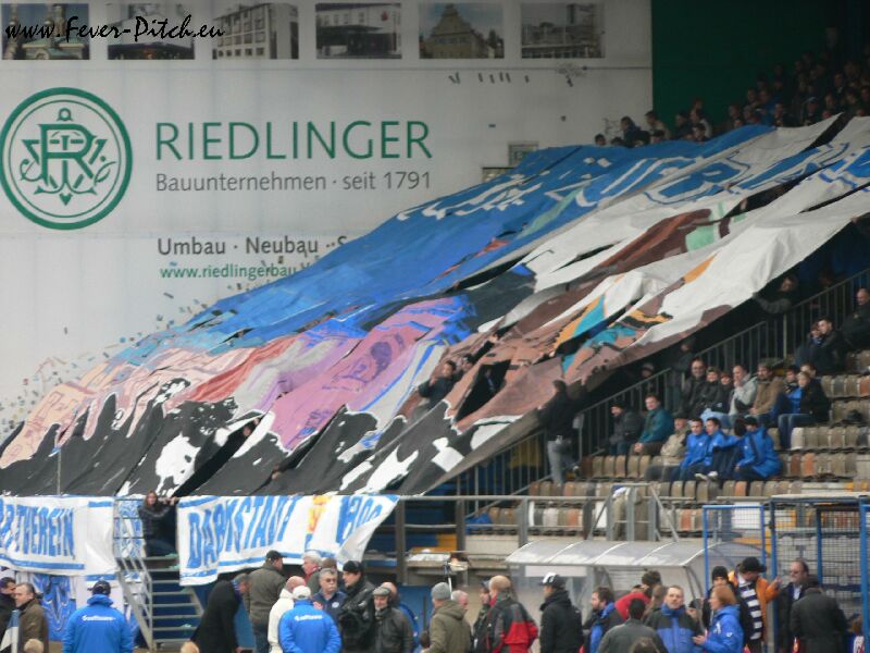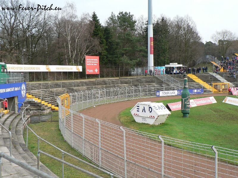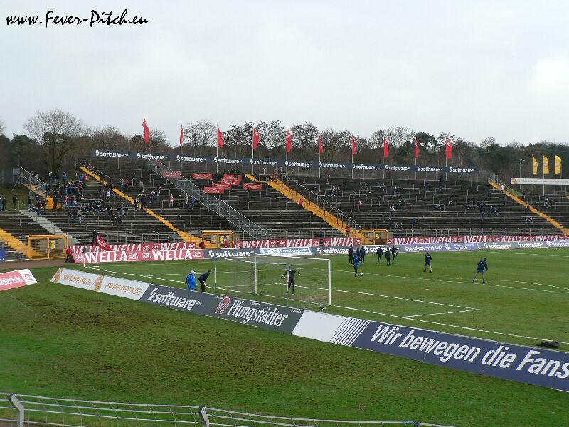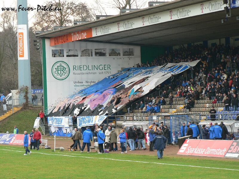 Gegen 13 Uhr und somit rund eine Stunde vor Kick Off hatte man sein Tagesziel erreicht. Die wucherhaften 4 Euro Gebühr für eine Parkmöglichkeit direkt am Stadion spart man sich am besten und fährt einige Meter die Straße runter, wo sich sicherlich noch was Kostenneutrales finden lassen sollte. Auf dem Weg zu den Kassen sprach uns auch gleich ein junger Darmstädter an, ob wir nicht gegen eine kleine Spende das örtliche Ultrazine (AusnahmezUstanD) haben möchten. Da ich sowas grundsätzlich unterstütze, gab ich ihm fürs Heft (inhaltlich nix Bahnbrechendes, aber dennoch ganz nett) großzügige 2, 50 Euro und er freute sich nen Ast (was gibt man denn sonst? 15 Cent?). Anschließend mal das Stadion betreten, was einiges kann. Eine schöne alte überdachte Tribüne und ansonsten unüberdachte Stehränge, wobei besonders die Gegengerade optisch überzeugt. Sicherlich ein deutsches Stadion mit hohem Wiedererkennungswert.