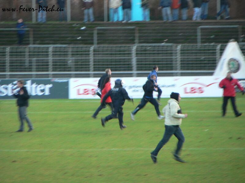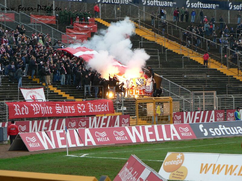 Ansonsten hantierte Darmstadts Szene mit vielen Fahnen und Doppelhaltern, was ein ganz nettes Bild abgab; gesanglich kam über weite Strecken nicht allzu viel rüber, was zum einem sicher an der Entfernung lag, zum anderen an der relativ geringen Zahl Aktiver. Mehr als 40 Leute waren selten am Support beteiligt (dazu gab es wohl noch Unterstützung aus Bern, zumindest der "Urban Squad" Fahne nach zu urteilen). Dafür lief überall im Stadion eine Menge Pöbel umher; hatte teilweise schon ordentlich Ost-Flair. Ne kleine Pyroeinlage seitens DA gab es dann zur Mitte der ersten Halbzeit auch noch, was den Schiri lächerlicherweise dazu veranlasste, das Spiel kurz zu unterbrechen. Anschließend konnten wir uns aber wieder dem Geschehen auf dem Rasen widmen, was doch mehr als unterhaltsam verlief. Für mich stand nach der 2:0 Führung der Südhessen der Sieg eigentlich schon fest aber bedingt durch eine Vielzahl kurioser Aktionen sowie äußerst merkwürdiger Schiedsrichteraktionen drehte Kassel das Spiel noch auf ein 2:3, was natürlich den Gästeblock gut toben ließ. Gerade in Zeiten der Spielmanipulationen kommt man bei sowas jedoch schnell ins Grübeln. Am Ende jedenfalls ein 3:2 für Kassel, die weiter in Richtung Aufstiegsplätze schielen können, wobei Darmstadt in den Niederungen der Liga verharren muss. So eine Auswärtsfahrt wünscht sich doch jeder Fanatiko. Nicht so Teile der Darmstädter Anhängerschaft, die einige Zeit nach Abpfiff überraschend den Platz stürmten und sich gen Gästeblock aufmachten. Dieser wurde auch nahezu erreicht, ehe man von den Cops wieder über den ganzen Platz zurückgetrieben wurde und sich eine wüste Auseinandersetzung zwischen Staatsmacht, Ordnern und halt eben Darmstädtern entwickelte, bei der alle Partien gut austeilten und einstecken mussten.