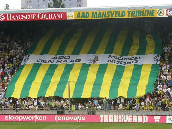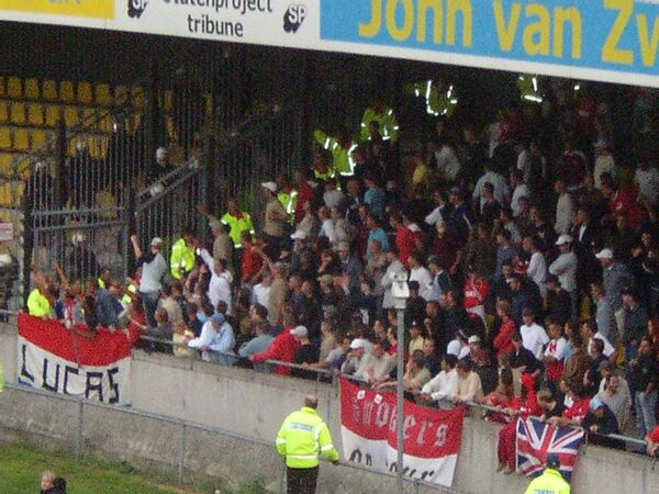 Gruppe von ca. 25 Den Haag Hools sammelte sich am Rand der Gegengerade und fiel