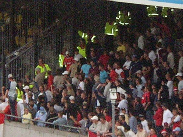 auch durch obszöne Gesten in Richtung Gästebereich auf. Der Pufferblock