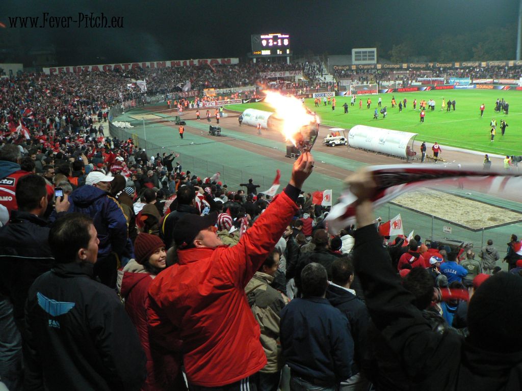 und werfen Feuerwerkskörper in den Innenraum und vor allem Böller und Bengalos