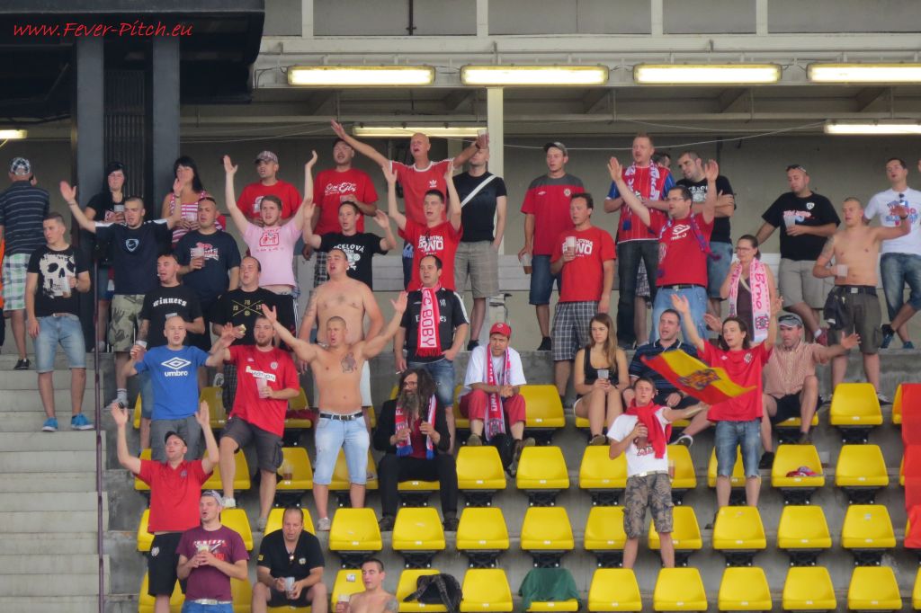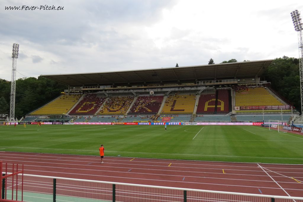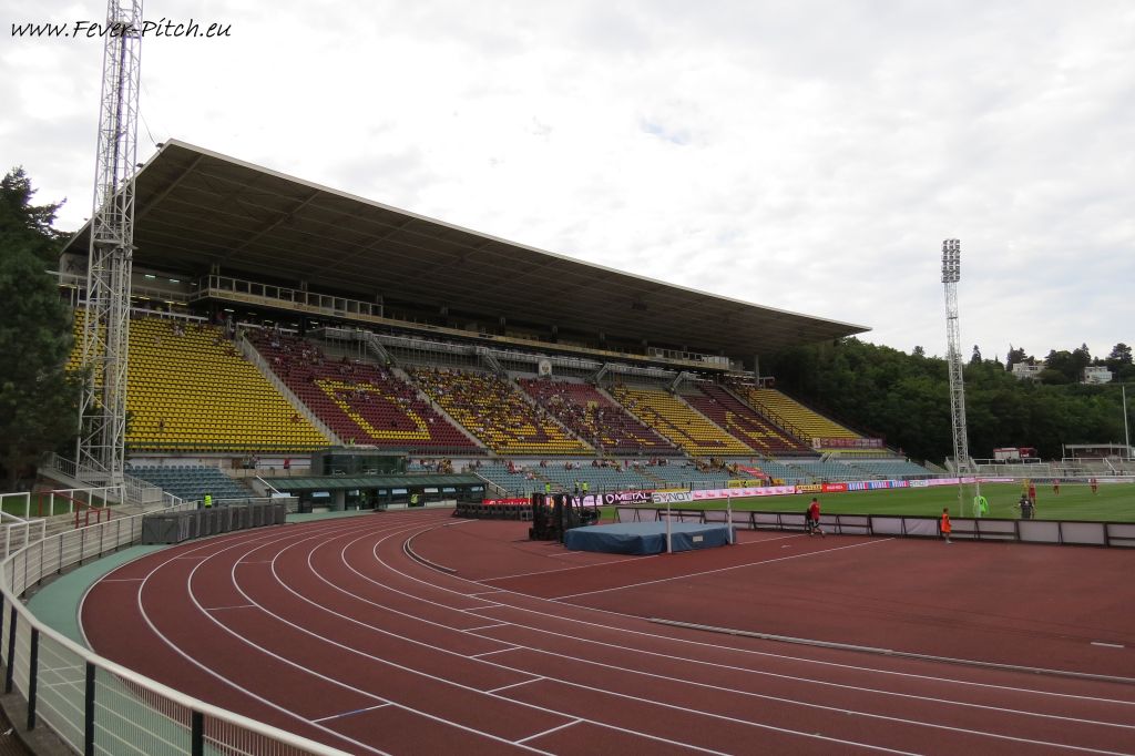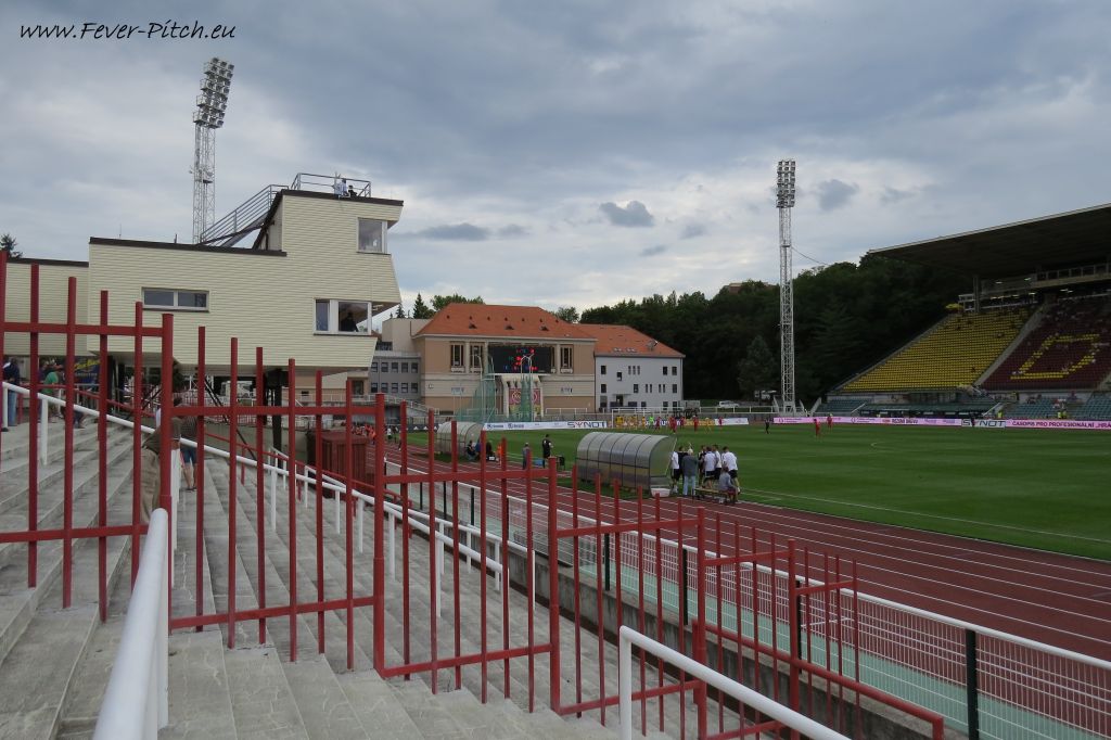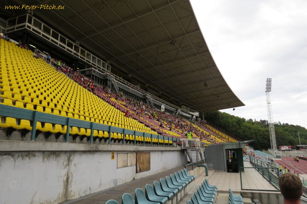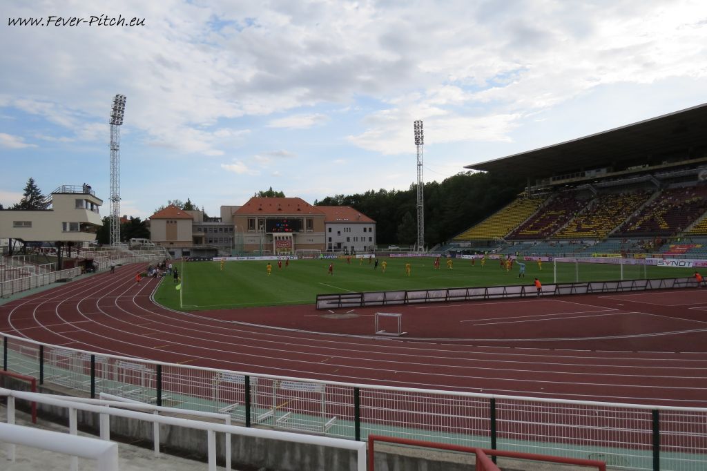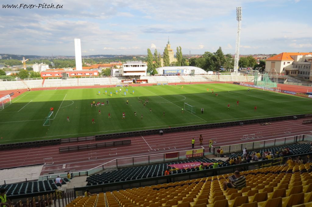 Leider zieht der Meister von 1953, 1956, 1958, 1961, 1962, 1963, 1964, 1966, 1977, 1979 und 1982 nicht gerade die Massen an, da man in der Beliebtheitsskala wohl ein ganzes Stück hinter Slavia, Sparta, Bohemians und vielleicht sogar Zizkov liegt. Die offiziell 1.579 Zuschauer verlaufen sich daher auch mehr oder minder im großen Stadion. Ein kleiner Haufen im mittleren unteren Bereich der Haupttribüne ist zwar um so etwas wie Stimmung bemüht und nebenan in der oberen Ecke der selben Tribüne machen ca. 40 Leute der Kategorie A-C aus Brno es diesen nach, aber das miese Ballgeschiebe ohne jegliche Torraumszene dort unten auf dem Feld, das manche Fantasten auch Fußball nennen würden, lässt keine ausufernde Stimmung aufkommen.