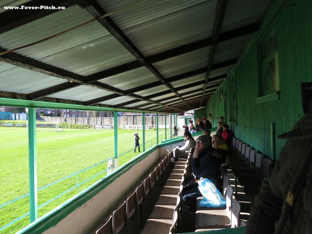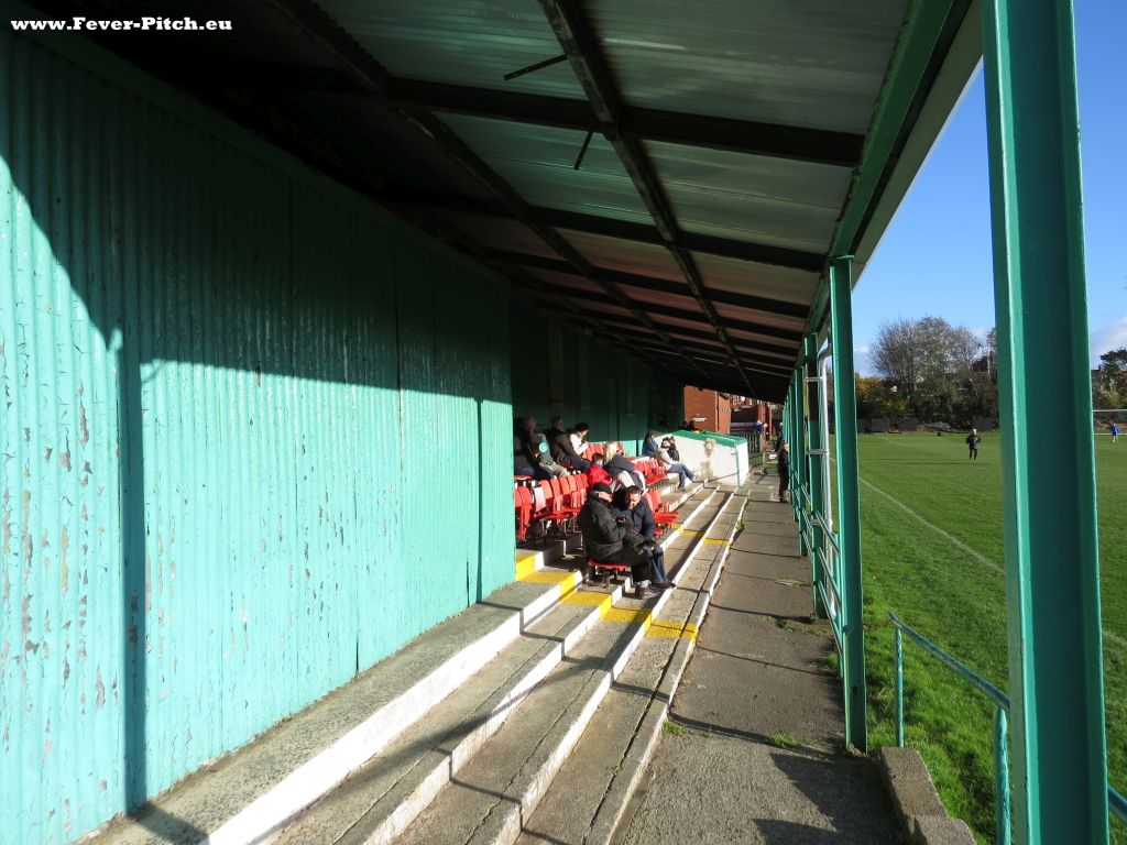 Eine kleine überdachte Sitzplatztribüne von Höhe Fünfer bis