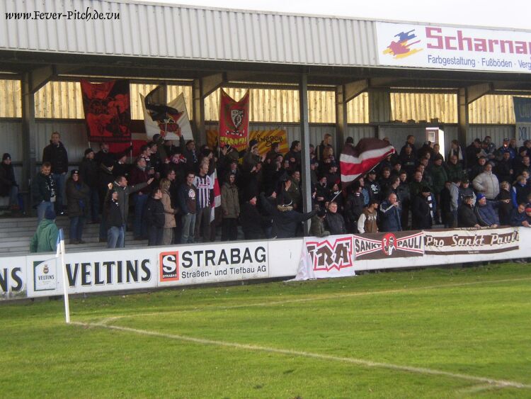 Anhänger vom Kiez genau neben dem Heimanhang am linken Tribünenrand