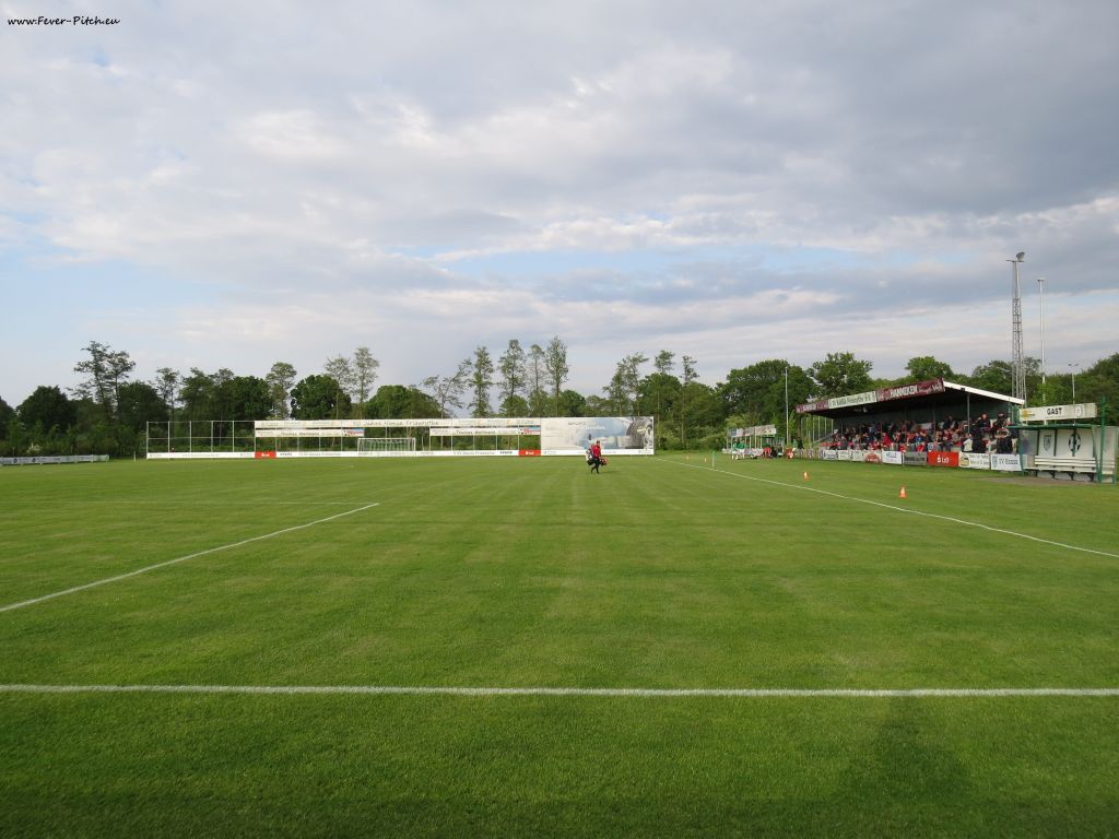 recht kompakt wirkenden Stadion mit kleiner Tribüne und augenscheinlich nicht