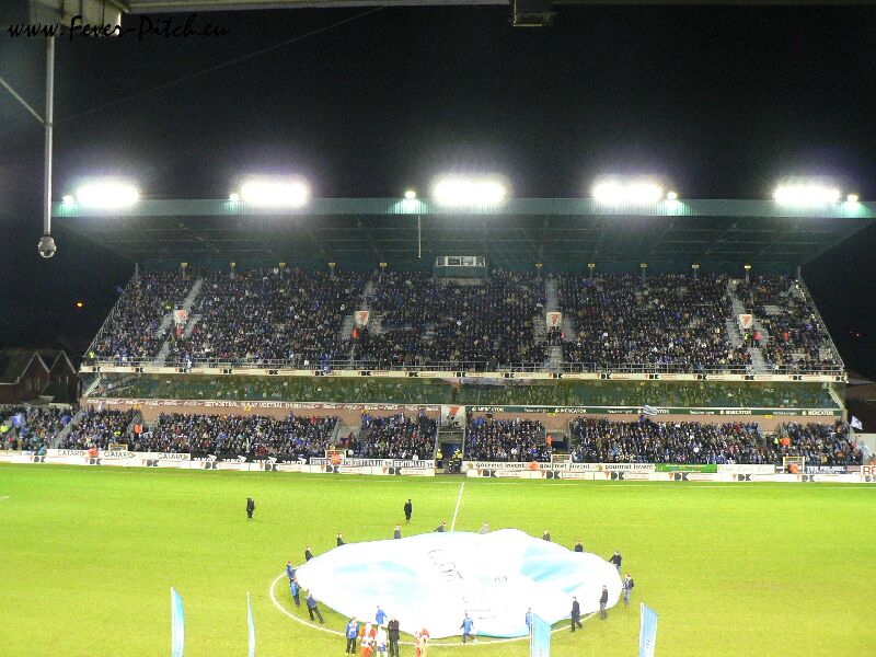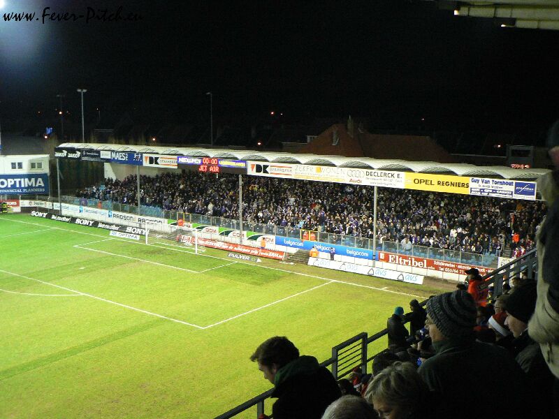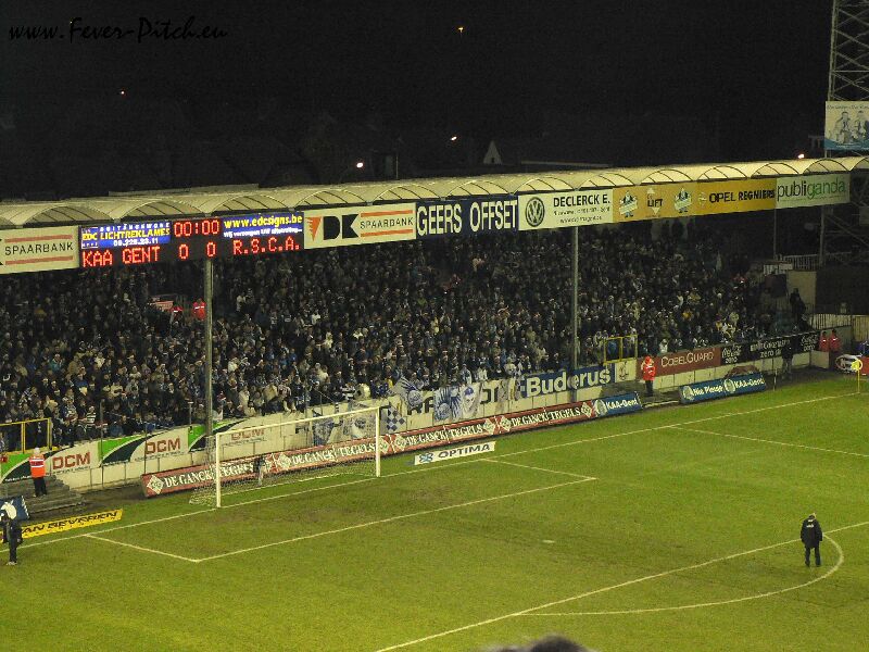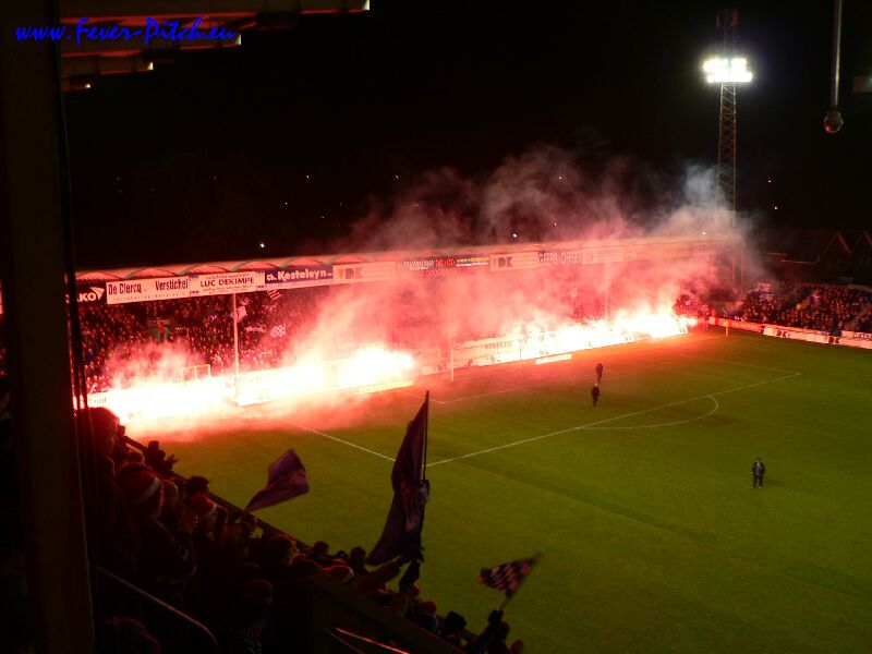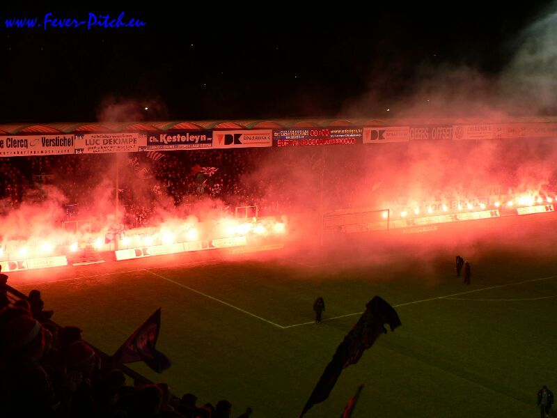 Ein schöner Doppler in Belgiens höchster Spielklasse bot Gelegenheit das Jahr 2009 zu den Akten zu legen. Den Auftakt bildete die o. g. Partie zwischen dem Tabellendritten (Gent) und dem Tabellenführer. Ein echtes Spitzenspiel also und dementsprechend auch ausverkauft. Gut, wussten wir vorher, aber wagemutig wie man nunmal ist, steuerte man dennoch das Stadion an. Irgendeine Möglichkeit gibt s doch immer, wir sind hier schließlich nicht bei Barca gegen Real am letzten Spieltag bei Punktgleichheit. Somit rund anderthalb Stunden vor Spielbeginn am Stadion, welches schön im Wohngebiet liegt, aufgetaucht, nur um sich bestätigen zu lassen, dass kein Kassenhäuschen mehr geöffnet hat. Für diesen Fall gab es aber einen Plan B und so gelangte man schließlich doch recht einfach, wenn auch etwas zwielichtig, auf eine der großen, steilen Tribünen auf der Geraden. Der Jan heulte zwar ein wenig rum von wegen das könne man ja nicht machen und sie würden uns rauswerfen, wenn sie uns entdecken usw. Naja, das legte sich dann aber auch recht schnell und zum Anpfiff hatte man einen ganz netten Platz unter den knapp 13.000 Zuschauern, von denen rund zehn Prozent den Gästen die Daumen drückten und somit die gesamte Hintertortribüne einnahmen. Vom Support her wie erwartet ziemlich britisch angehaucht, also hin und wieder mal Gesänge, dafür kaum Fahnen, keine Doppelhalter oder gar Pyrotechnik. Letzteres gab es hingegen auf Heimseite en masse, wenn auch allerdings nur als vereinsoffizielle Variante, also auf einem Gestell automatisch gezündete bengalische Fackeln. Sah ganz nett aus, dennoch geht natürlich nichts über die urtümlich, anarchistische Variante, nämlich quer im Block verteilt. Gent konnte jedenfalls im Folgenden öfters mal durch guten Support überzeugen, hohe Lautstärke und gute Mitmachquote und somit dem Gästemob stark überlegen. Doch, das war streckenweise unerwartet gut. Dieser Funke schien auf die Mannschaft überzuspringen, welche sich eine 2:0 Führung leidenschaftlich herausspielte aber leider nicht halten konnte und sich somit mit einem 2:2 begnügen musste. Wer solche Spiele noch dreht, der steht wohl am Ende der Saison oben, sag ich mal so. Vielleicht noch ein paar Zeilen zum Team aus Gent: Irgendwie scheint man hier leicht vernarrt in Indianer oder sowas zu sein. Das Vereinswappen ziert ein Häuptling, das Team wird auch "Buffallos" genannt und das Stadionmagazin heißt "Wigwam". Ganz seltsam. Zudem liefen vor Anpfiff ein paar Typen im Häuptlingskostüm herum, der eine wurde später während des Spiels im Fanblock gesehen und gab dort jedem die Hand