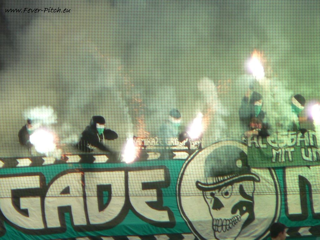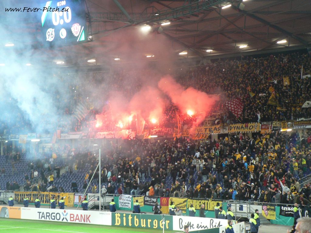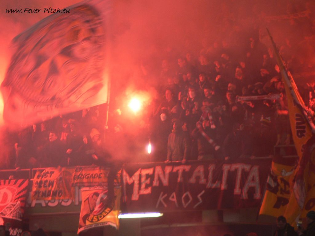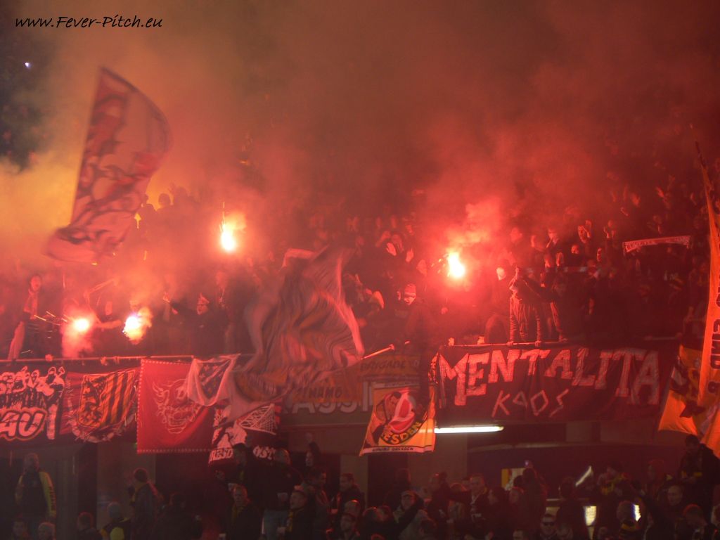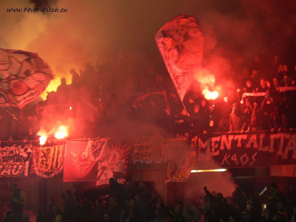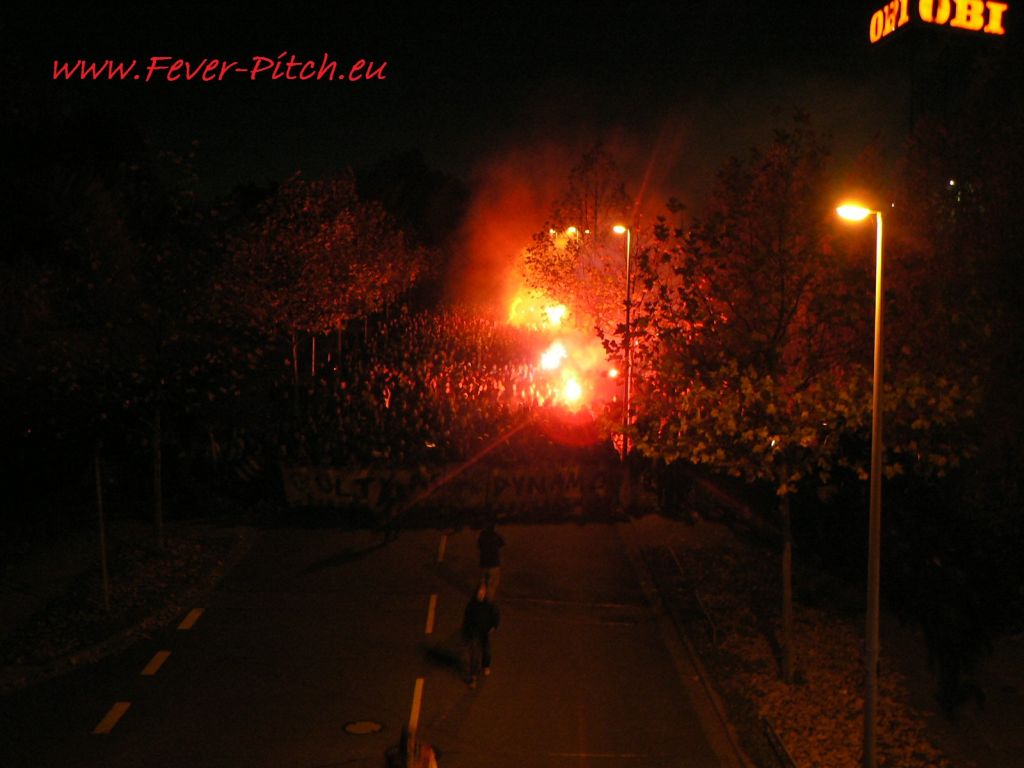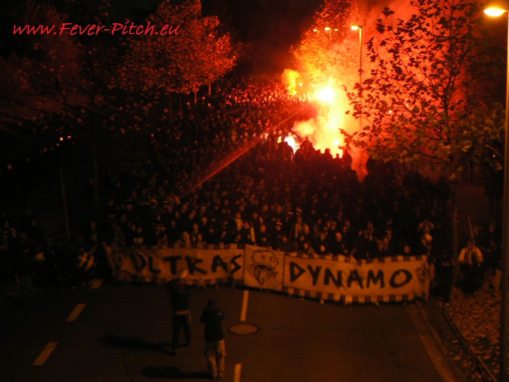 anschließend der Gästehaufen ganz langsam hinter der Ultras Dynamo Zaunfahne