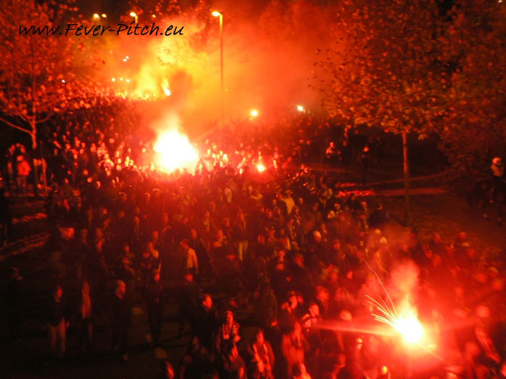 Oberrang, ehe Brigade Nord im Unterrang mit grünen Bengalos nachzieht. Völlig