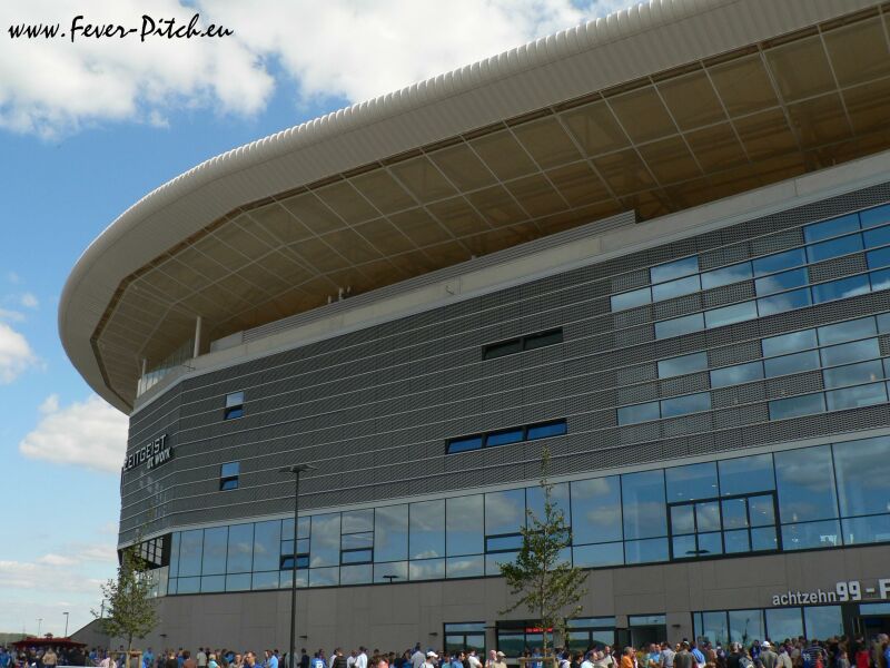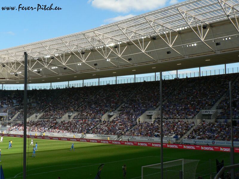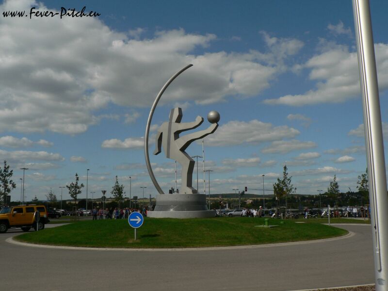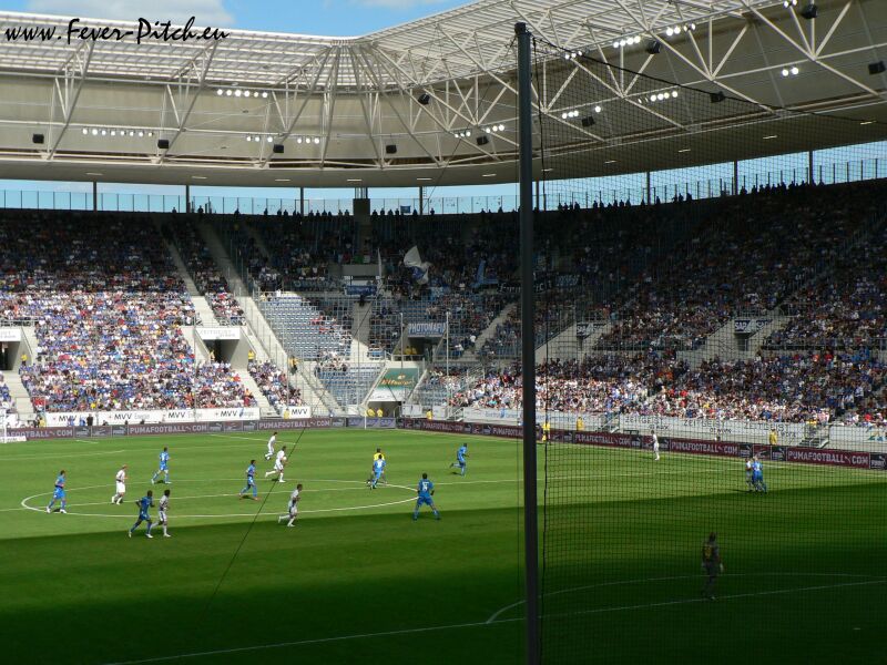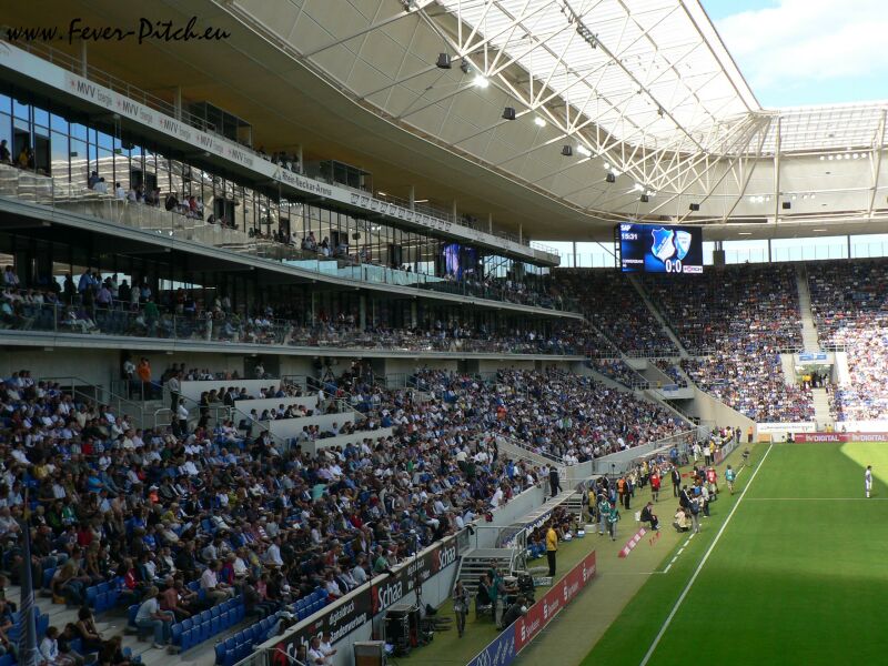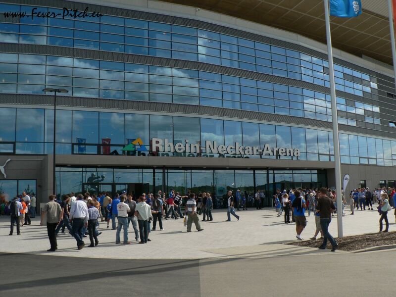 Der Jan war heute fest entschlossen, Deutschlands höchste Spielklasse zu komplettieren und somit muss auch ein Ground wie der im beschaulichen Sinsheim besucht werden. Da auch mir dieser wunderschöne Neubau noch fehlte, war ich natürlich dabei und wurde morgens um halb zehn abgeholt. Da wir geschickt einige Staus im Kölner Raum umfuhren, kam man auch nach nur vier Stunden Fahrtzeit am Bestimmungsorte an und trug seinen ersten Teil zur Refinanzierung der Rhein-Neckar-Arena bei, indem man sündhafte 5 Euro Parkgebühren zahlen musste. Das Stadion wurde vor etwa einem dreiviertel Jahr lieblos inmitten des Nirgendwos hingeknallt und entspricht dem, was ich mir ausgemalt habe. Viel Glas und Kunststoff, dafür umso weniger Stahl und Beton. Kurzum kein Stadion, das ein Kribbeln in der Magengegend hervorruft, wenn man es zum ersten Mal sieht.