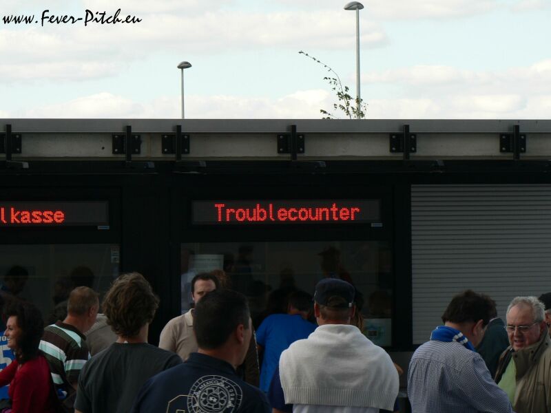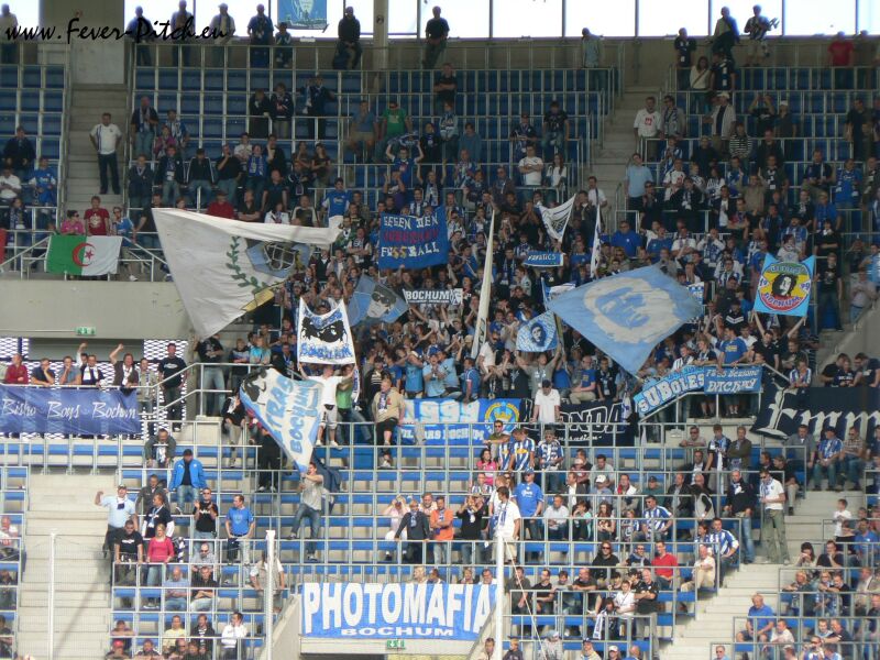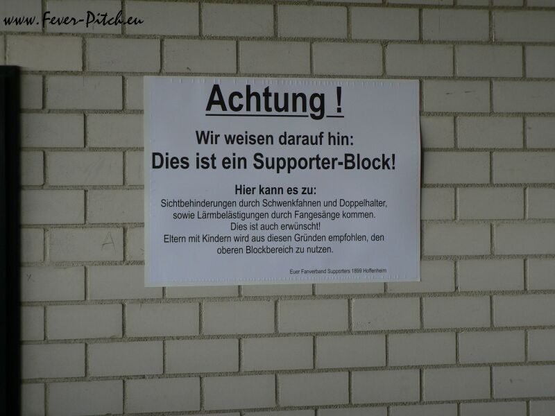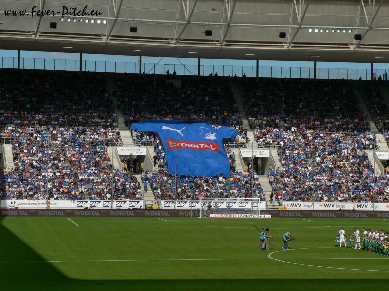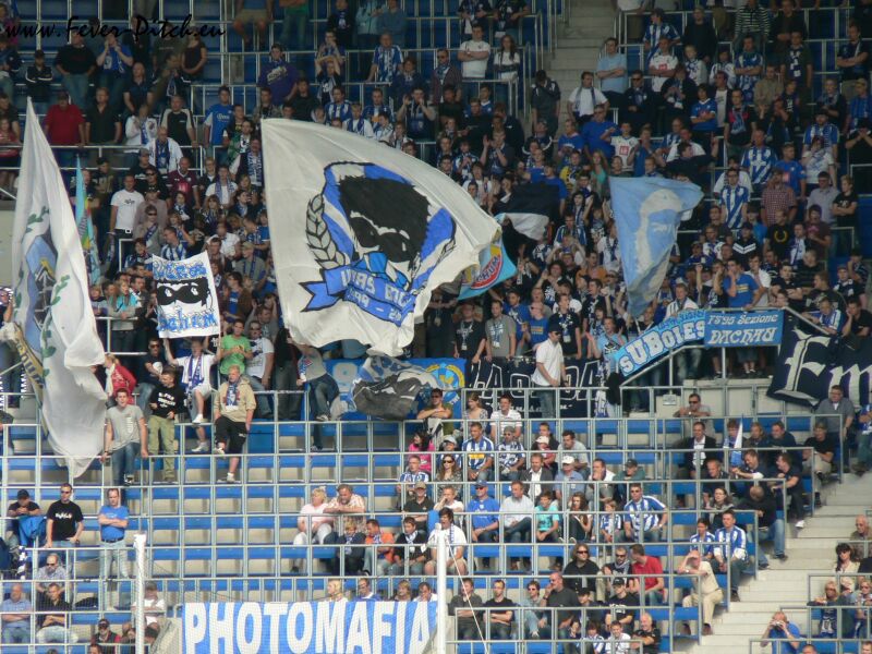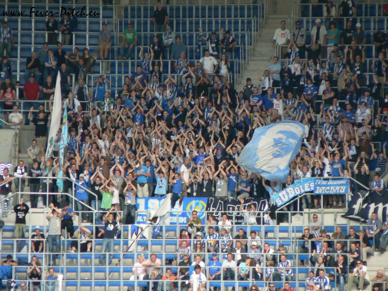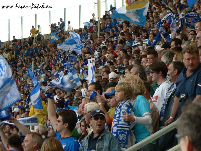Bevor es endlich losgeht, bekommt man zuguterletzt noch das Vereinslied um die Ohren gehauen, in dem sich so geistreiche Zeilen wie Hoffe, Hoffe, super Hoffe .. finden, zu dem alle Zuschauer mit ihrem neu gekauften Schal wedeln. Als das Spiel dann beginnt, erhebt der Supportersblock der Heimfans seine Stimme. Nichts Besonderes, nichts was sich vom Mainstream deutscher Kurven in irgendeiner Form abhebt, zudem lässt man bereits nach zwanzig Minuten stark nach. Im Eck auf der gegenüberliegenden Seite hatten sich ca. 800 Bochumer eingefunden, von deren Hauptteil zwar man kaum etwas hörte, dennoch war dort ständig Bewegung, viel Armeinsatz usw. Geht also ok, zumal die eigenen Mannschaft ja heute mal gar nichts zeigte. Hoffenheim war ebenfalls nicht überragend, erzielte aber dennoch mal locker und ohne viel Mühe durch Ba, Obasi und Compper drei Treffer und ebenso viele Punkte mehr als die Gäste. Paar Minuten vor Schluss haben wir genug gesehen und sprinten zum Auto, um dem unvermeidbaren Abfahrtchaos zu entgehen, was hervorragend gelingt.