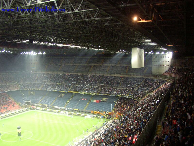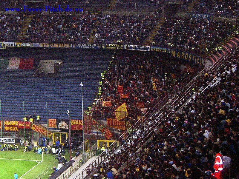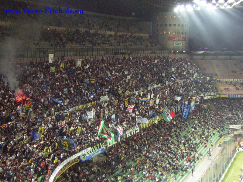 Dazu kam, dass der Support der Nordkurve heute um Klassen besser war als noch im Januar gegen Sampdoria. Hammerlaut gab der erste Capo per Beschallungsanlage den Takt vor und der Rest der Kurve gab es ihm doppelt so laut zurück. Da hatten die etwa 800-1000 (Zahlen schätzen ist weißgott nicht meine Stärke) Süditaliener aus Lecce es wirklich sehr, sehr schwer, sich Gehör zu verschaffen, sodass sie sich kurzzeitig lieber per Spruchbänder äußerten. Was drauf stand, hat mir Michi zwar übersetzt, ich habs aber schon vergessen.