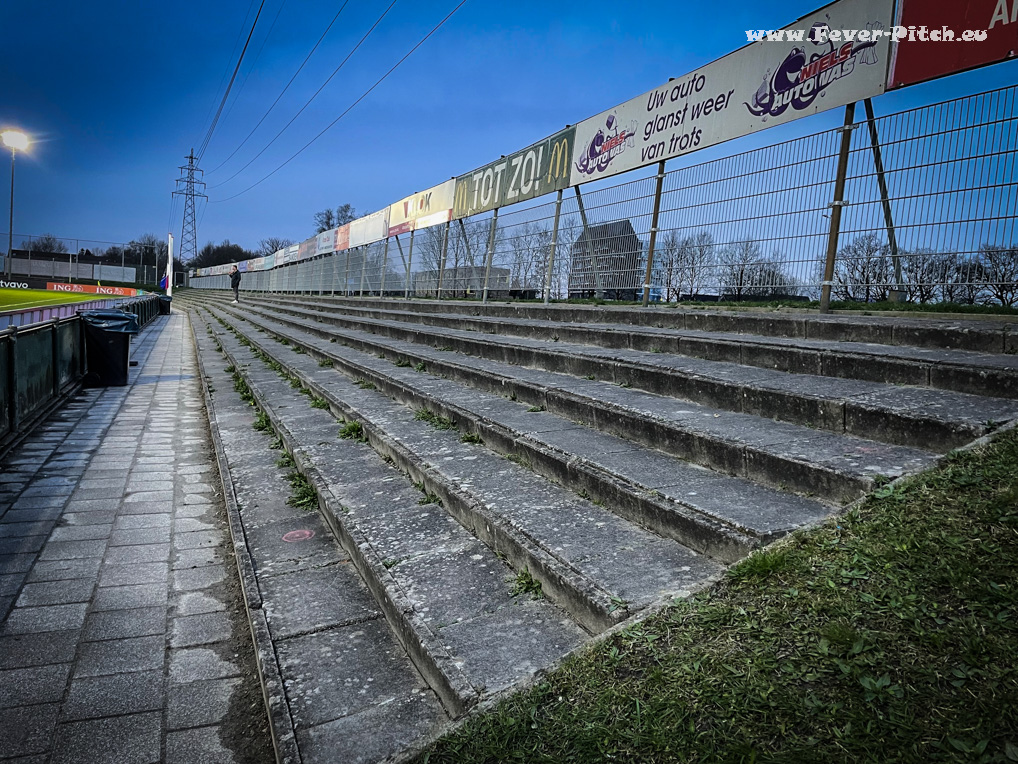 Eine kleine überdachte Haupttribüne, hinter der sich die einladende und