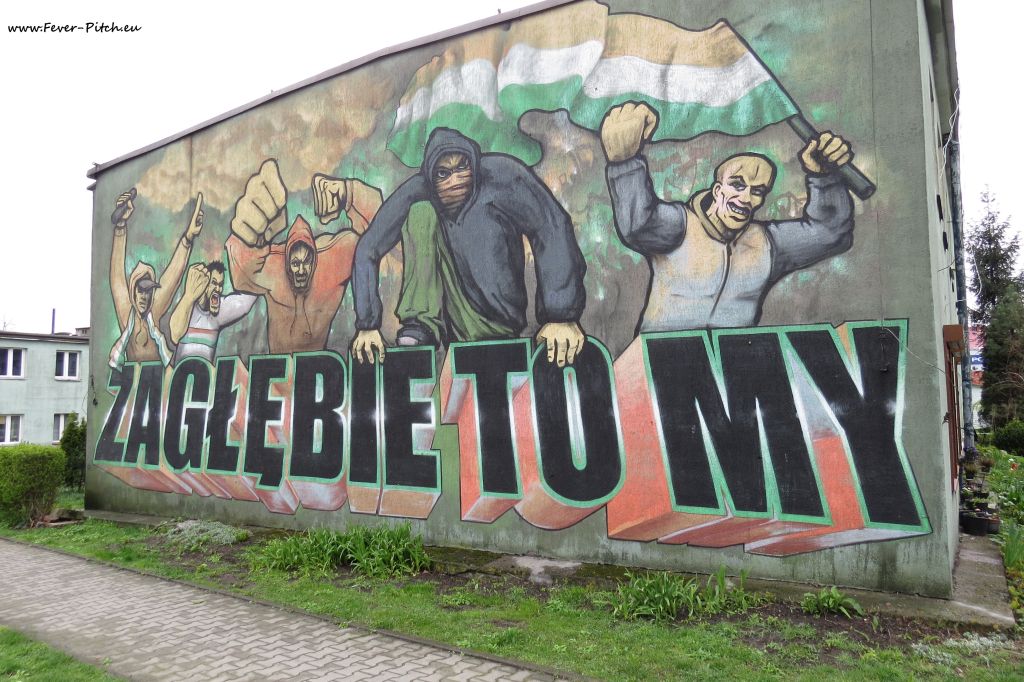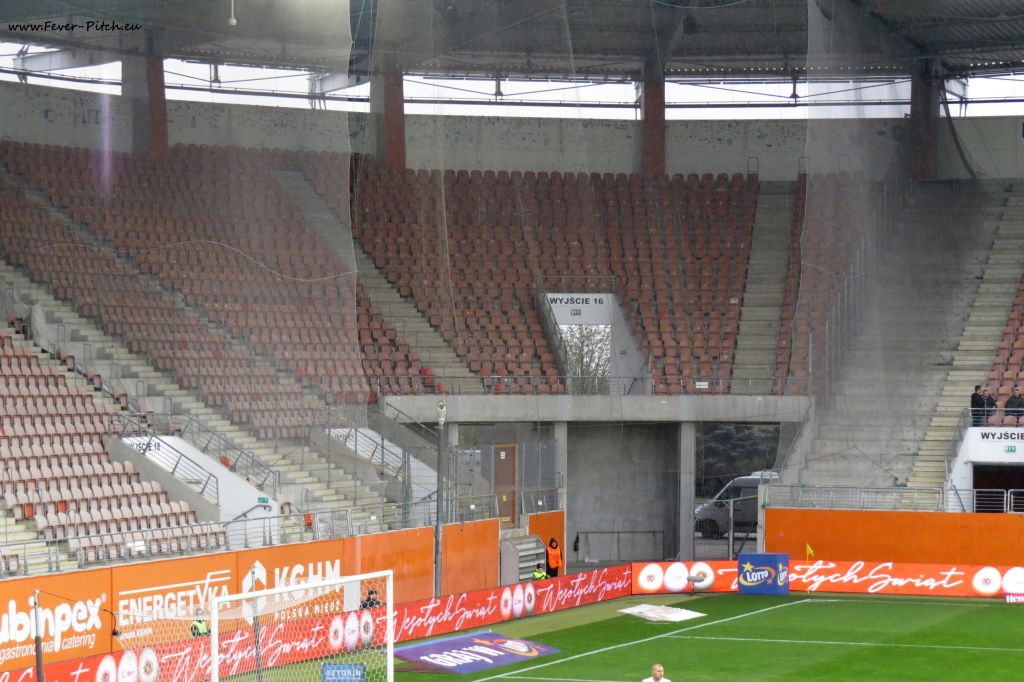 eine gute halbe Stunde vor Anpfiff in Sichtweite vom Stadion Zaglebia Lubin, welches