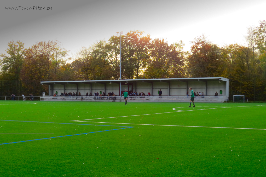 Kunstrasenplatz mit einer kleinen überdachten Sitzplatztribüne auf der Geraden.