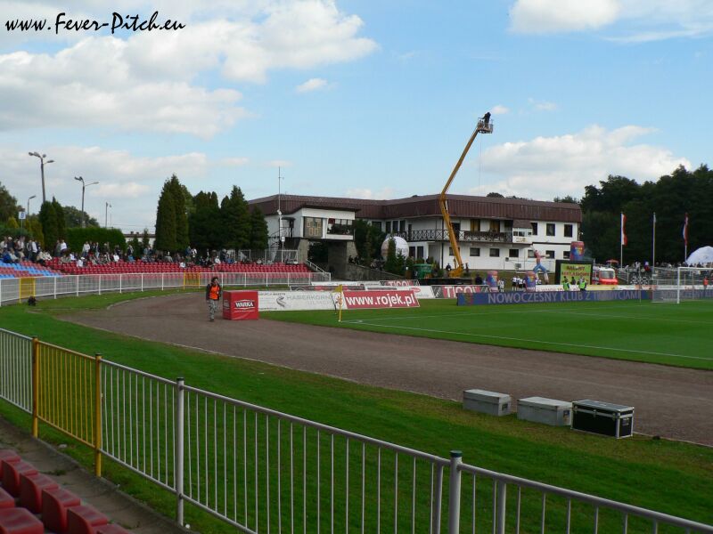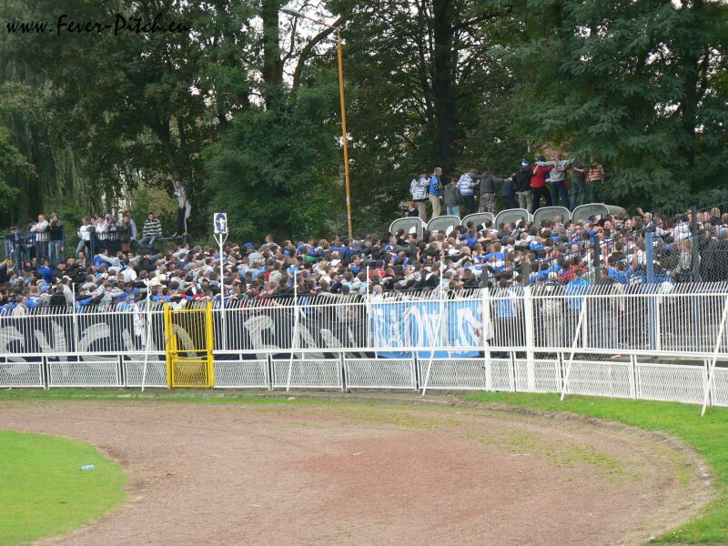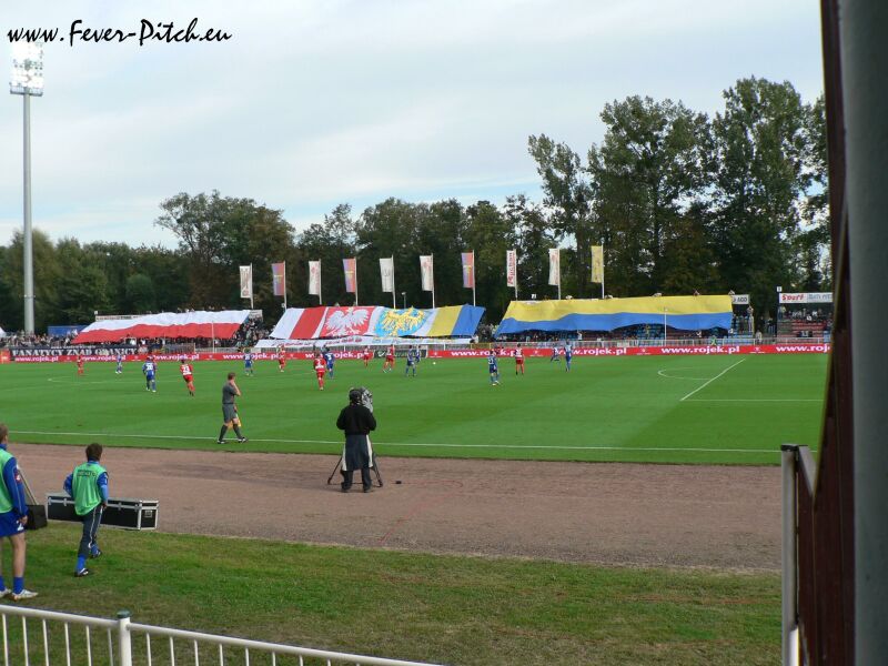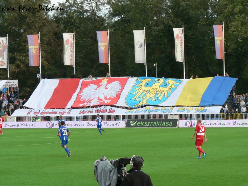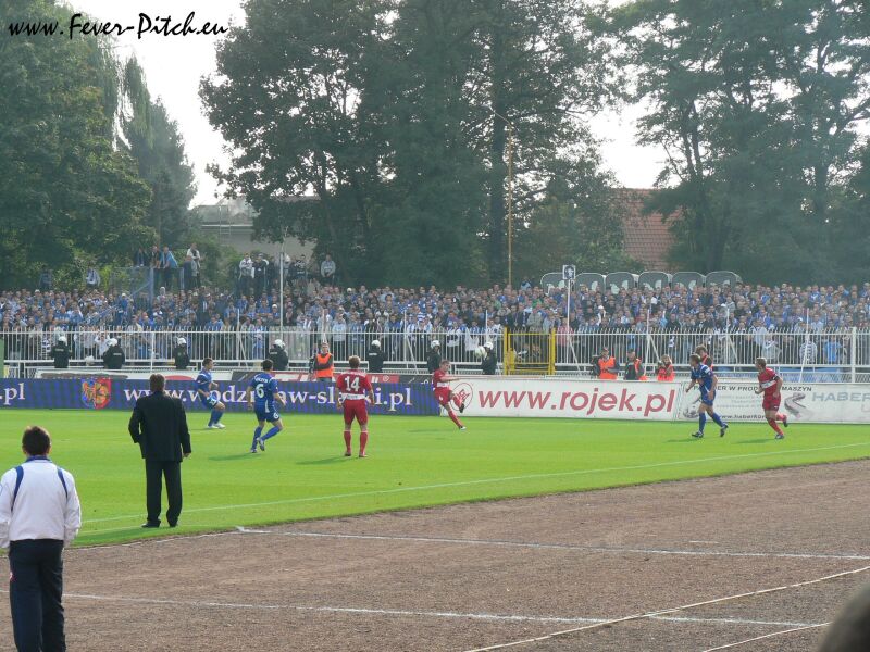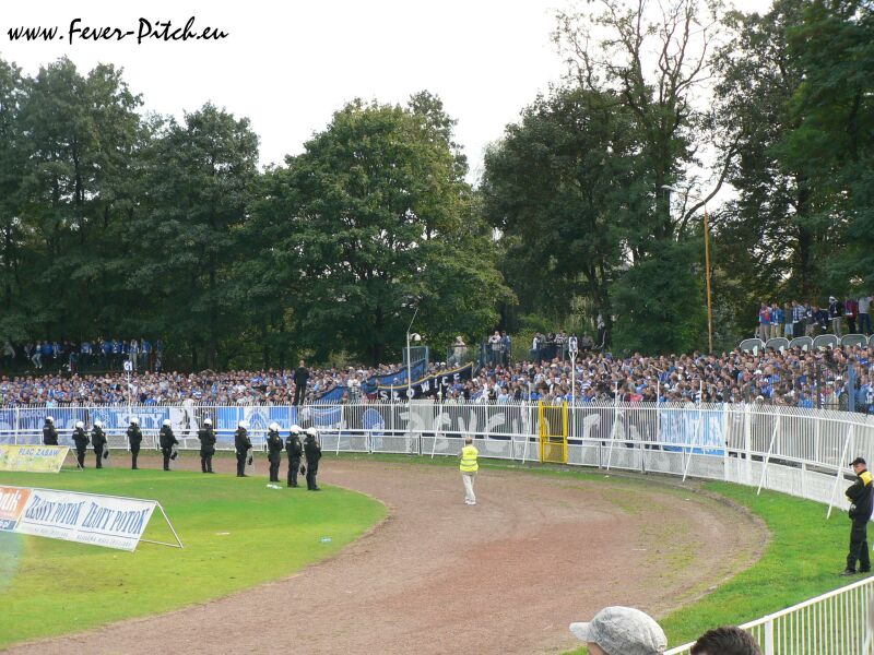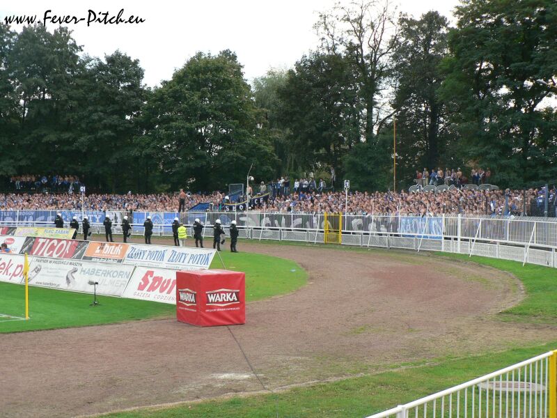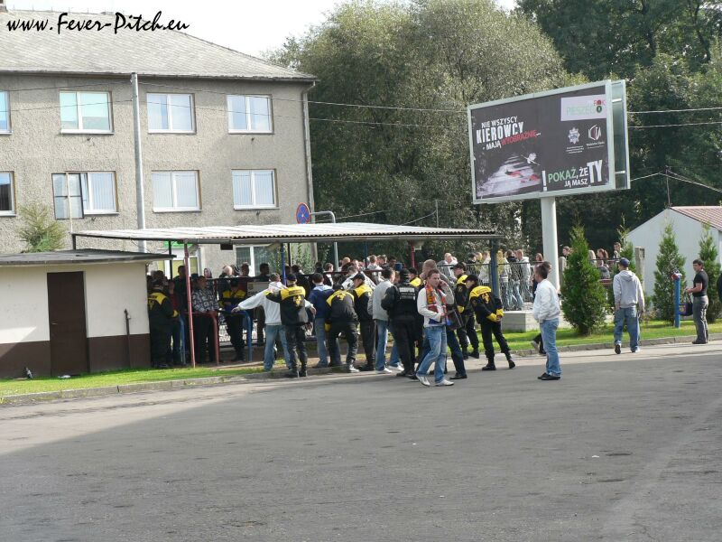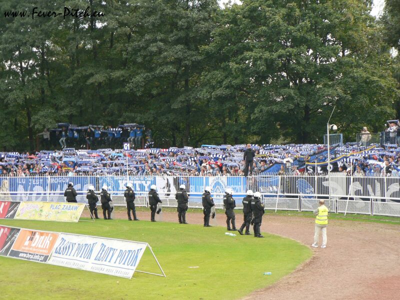 Die Zeit bis zum Anpfiff streunte man etwas im Stadion umher als sich plötzlich vor dem Stadion ein 30-köpfiger Mob in Gerenne übte und zu allem Überfluss in Richtung unseres Mietwagens steuerte. Grund konnte nicht ganz aufgeklärt werden, scheinbar sollte ein Bus aus Chorzow "begrüßt" werden. Polizei aber schnell zur Stelle, sodass sich alles schnell beruhigte und unser Wagen auch unbeschadet blieb.