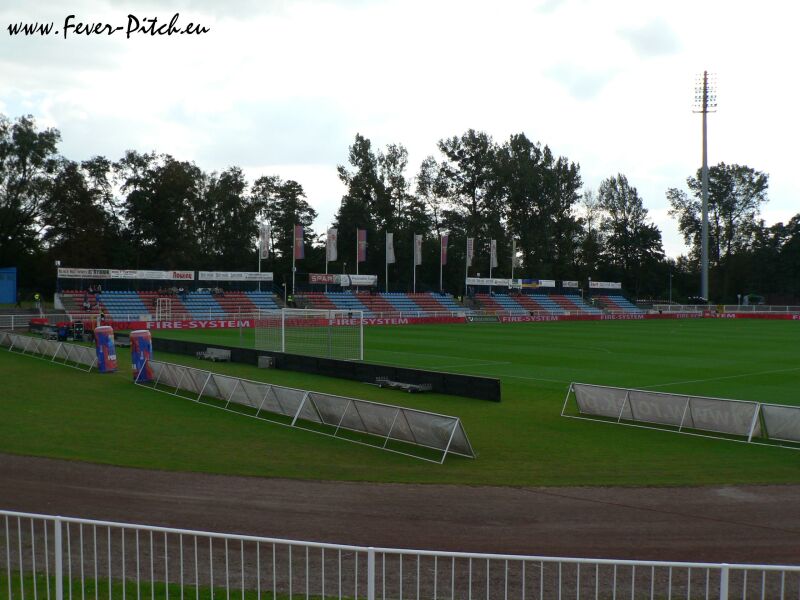 Der Fanblock des Heimteams befindet sich in der Ecke der Gegengeraden und fasste