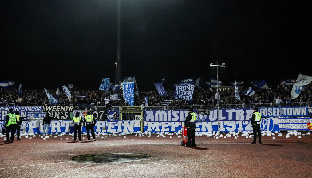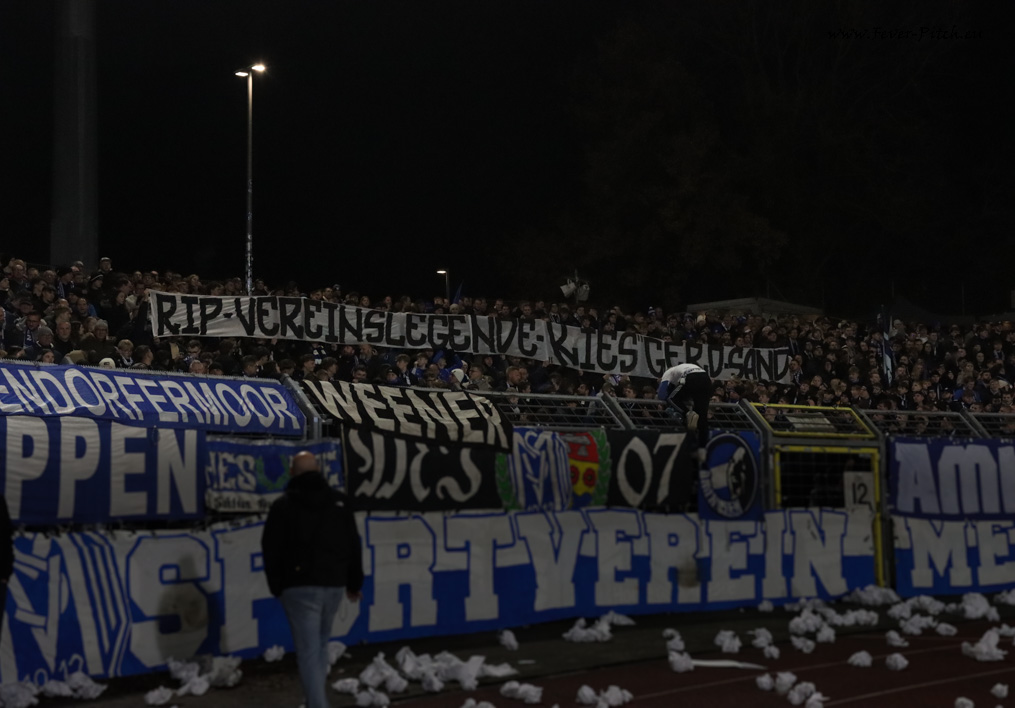 widmen ein Spruchband der kürzlich im Alter von 85 Jaren verstorbenen SV Meppen