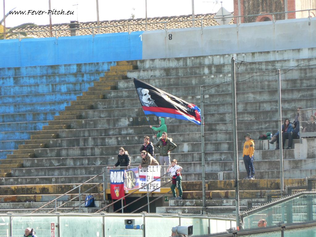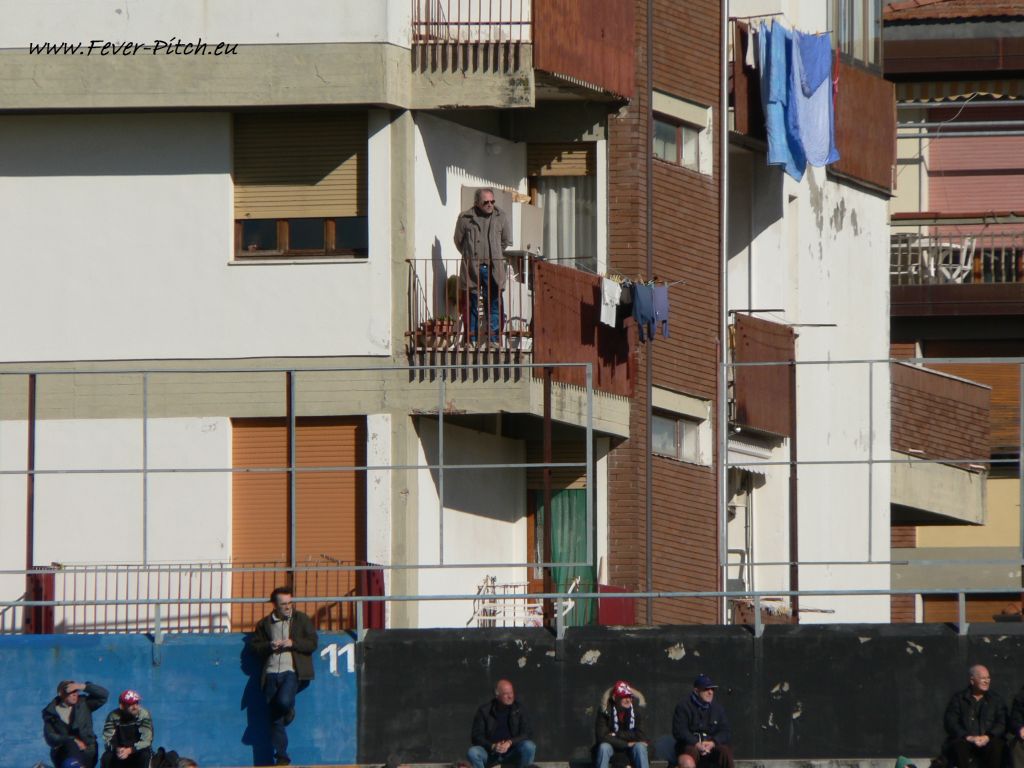 Vom Team der Gäste hatte ich jetzt ehrlich gesagt noch nie etwas gehört und man scheint jetzt auch keine allzu große Nummer zu sein. Trotz relativer Nähe zu Pisa (naja, rund 250 km) nur abgezählte 30 Gästeanhänger, wovon eine Handvoll hinter ein paar Fahnen um so etwas wie Unterstützung bemüht war. Hatte aber alles etwas von Kindergeburtstag oder Familienausflug. Der Jan war übrigens der Meinung auf dem Schwenker sei das Konterfei eine gewissen Adolf H. aus Braunau am Inn zu sehen. Kann ich aber so nicht bestätigen.....