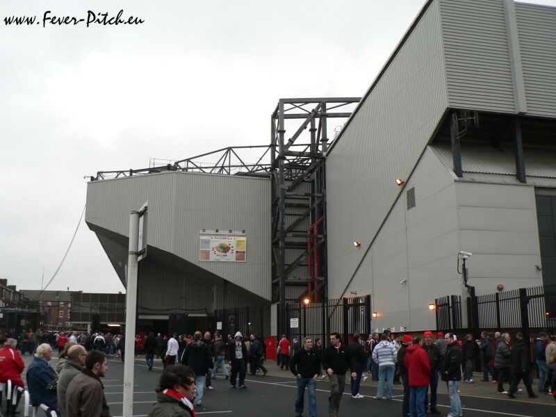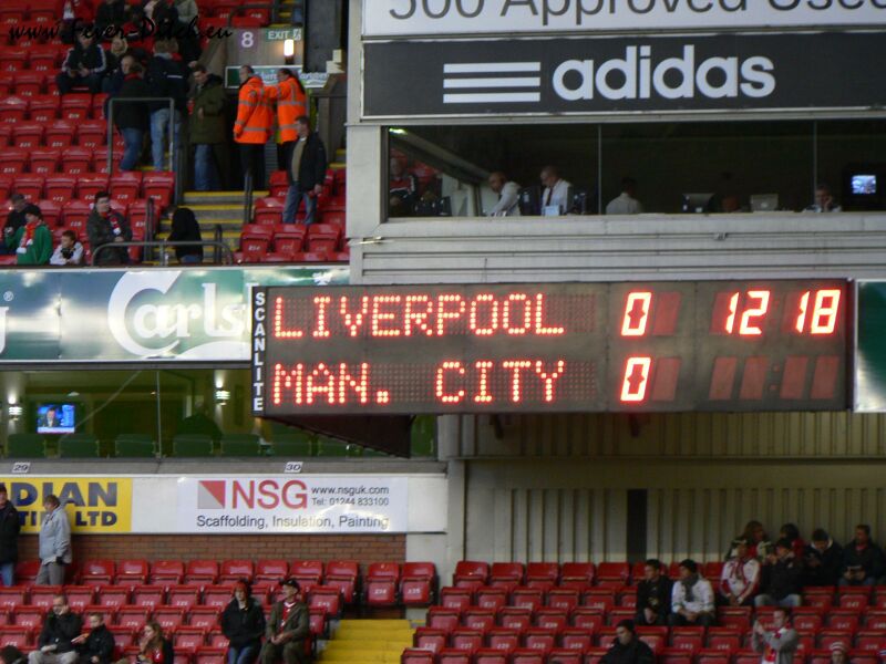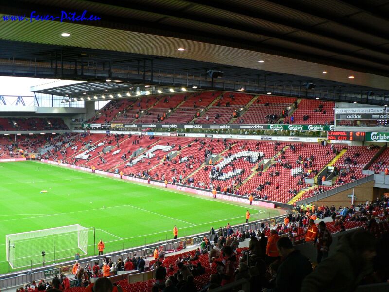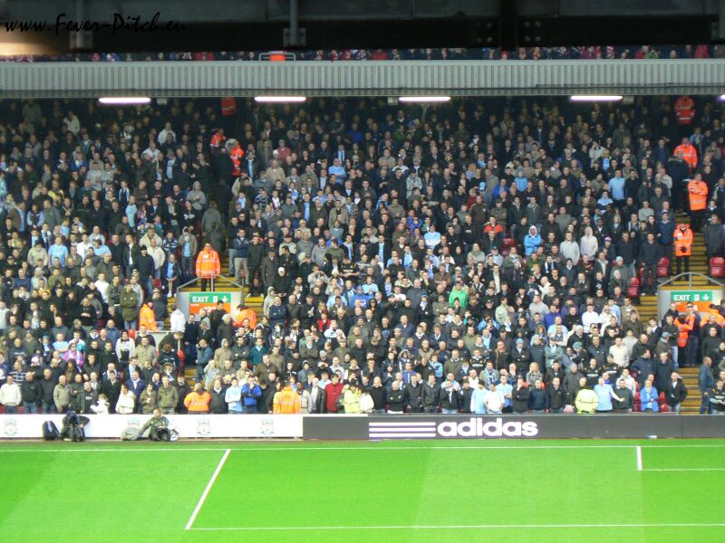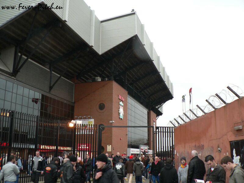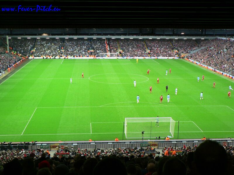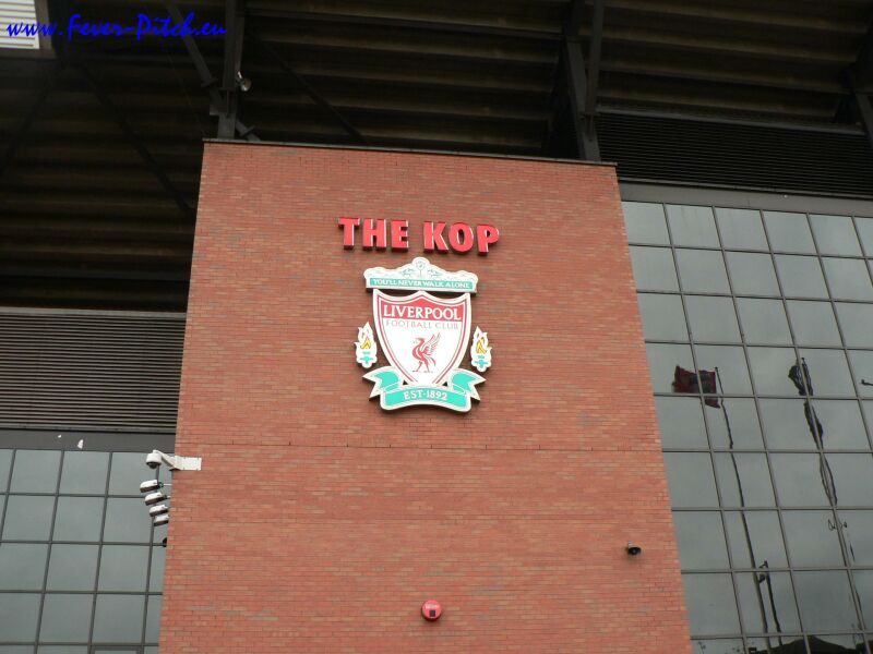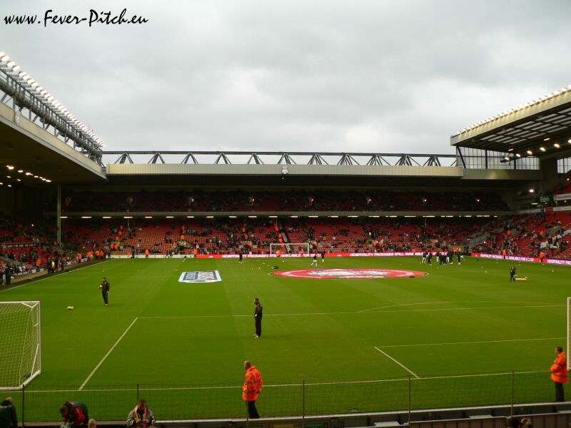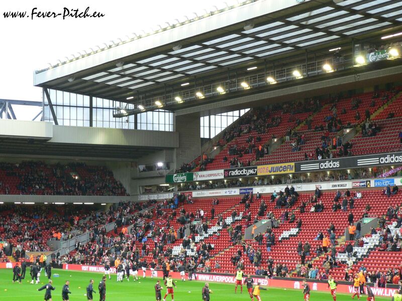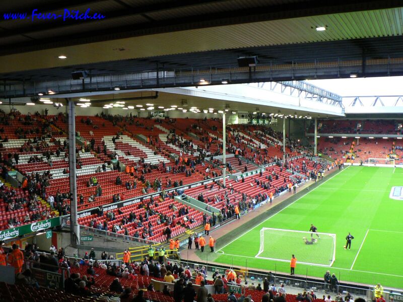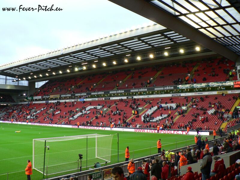 Nun aber schnell weg hier. Am Gate fanden sich noch einige weitere Herren ein, die wohl eines der beiden Spiele besuchen wollten. Beispielsweise ein Vater mit Sohn inkl. Liverpoolschal sowie ein halbes Dutzend Niederländer, die wohl aufgrund ihrer Poloshirts irgend nem ManUnited-Supportersclub angehörten. Während des Fluges fragte dann sogar der Steward noch via Bordmikrofon, ob für diesen Trupp noch jemand ein Ticket übrig hätte. Meldungen blieben allerdings Fehlanzeige. Nach etwas über eine Stunde setzte man dann auch schon am John-Lennon-Airport in Liverpool auf, begab sich mit dem Shuttlebus binnen 30 Minuten zur Bahnstation Lime Street, welcher soetwas wie der zentrale Verkehrspunkt in Liverpool ist. Hier kurz Überblick verschafft und mal die Weiterfahrmöglichkeiten zur Anfield Road geprüft. Ziemlich übel jedenfalls hier an gescheite Infos zu kommen; ne Metro scheint es nicht zu geben, Busse fuhren zumindest von hier irgendwie nicht in Richtung Stadion, also musste es kurzerhand den anderen Tommys nachgemacht und ein Taxi geordert werden. Dieses Prozedere verläuft hier etwas anders als bei uns in Deutschland, wo beim Warten auf ein Taxi meist wüst gepöbelt wird und sich letztendlich derjenige mit den durchsetzungsstärksten Ellenbogen als Erster setzen darf. Doch nicht so hier: Hier ist man schließlich Gentlemen und hat Stil und Benehmen. Man stellt sich artig in eine Schlange am Bürgersteig und besetzt dann der Reihe nach die vorfahrenden Taxis. So hatten auch wir bald unsere Fortbewegungsmöglichkeit gefunden und um 6 Pfund ärmer standen wir nach etwa zehnminütiger Fahrt vorm Stadion. Laufen wäre vielleicht auch möglich gewesen, allerdings hatten wir mangels Stadtplan keine Orientierung, das Stadion ist kaum ausgeschildert und außerdem nieselte es fies von oben, was mich bei sich anbahnender Erkältung wenig erfreute. Nun standen wir also im Menschengewusel vor dem Stadion, welches zu den ganz großen seine Gattung gehört, zumindest was den Mythos angeht. Ja, es gibt sicherlich Stadien, die stehen, warum auch immer, über den anderen. Das San Siro gehört sicherlich dazu, das Camp Nuo ebenso und Anfield natürlich auch. Diesen Ort wollte ich schon immer mal besuchen und nun war ich tatsächlich hier. Sicherlich ein magischer Ort und ich fühlte mich zeitweise wie der fünfte Beatle. War schon cool. Ein Schwarzmarkt war übrigens auch vorhanden, zumindest konnte ich wenigstens einen Typen erspähen, der Karten vertickte. Also sicherlich auch hier ne Alternative an Karten zu kommen, wobei bestimmt nicht die Günstigste. Sollte uns heute jedenfalls nicht jucken, also mal herein in die Stube. Karten hatten wir für "The Kop", also die legendäre Hintertortribüne, die gemeinhin als das Herz der Anfield Road bezeichnet wird, da von hier die Stimmung (wenn man in England überhaupt groß von Stimmung sprechen kann) ausgeht. Also mal ein paar Fotos geschossen und die restlichen Minuten zum Kick Off abgewartet. Ganz englandtypisch füllte sich das Stadion erst kurz vor Anstoß komplett, was auch nicht weiter verwundert. Alkohol und sogar Zigaretten sind auf den Tribünen gänzlich verboten, sodass alle Abhängigen ihre Droge so lange wie eben möglich genießen wollen. Geil auf jeden Fall, dass im "Kop" das Spiel trotz Sitzplätzen noch überwiegend stehend verfolgt wird und auch das allseits bekannte "You`ll never walk alone" kurz nach Spielbeginn kam von hier schon gut rüber und erzeugte leichte Gänsehaut. Das Folgende kann nun aber schwer bewertet werden. Regelmäßig wurden im "Kop" Gesänge angestimmt, die zum Teil auch sehr geil textlastig waren und laut rüberkamen. Letzteres muss aber allenfalls subjektiv gesehen werden, da man selber im Kern stand und von dort halt die Gesänge grundsätzlich laut wirken, auch wenn tatsächlich gegenüber kaum was ankommt.