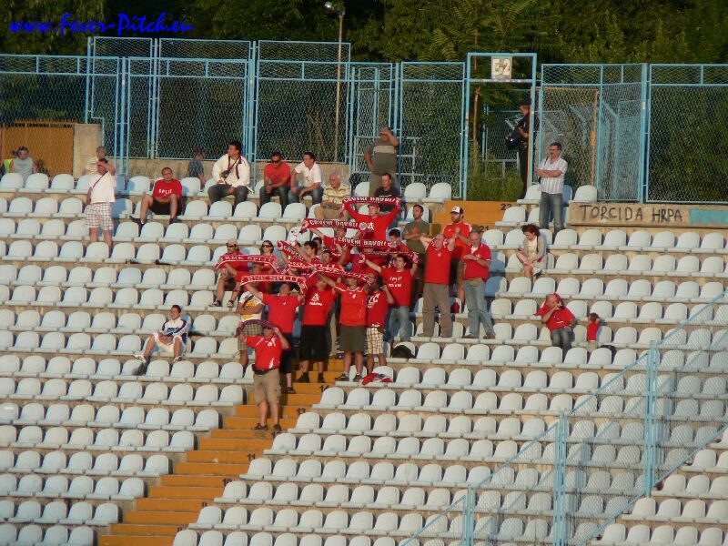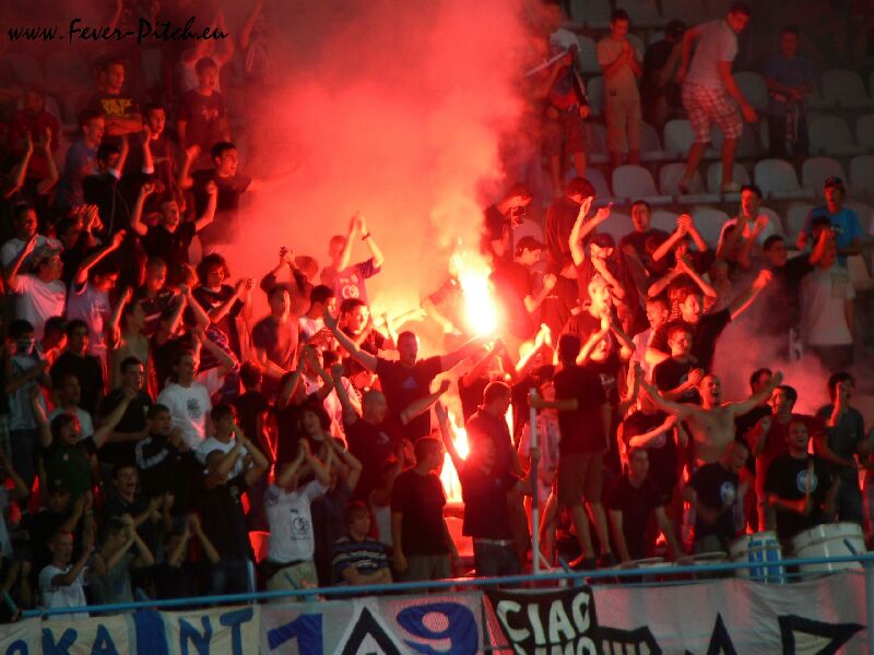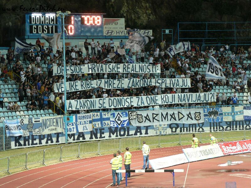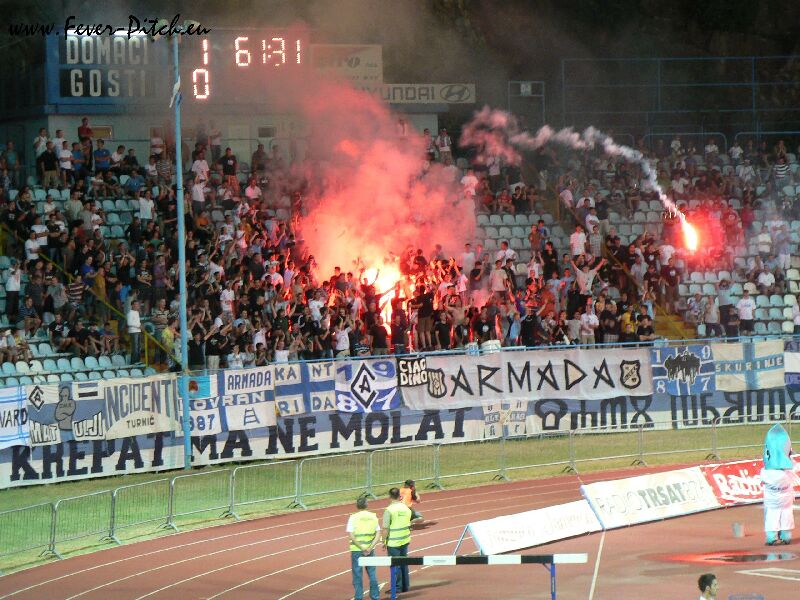 Wider Erwarten immerhin begleitet von rund 30 Fans mit fünf Zaunfahnen (Crveni Davoli; also "Rote Teufel"), zeigten diese ein paar Klatscheinlagen, Schalparaden und sangen hier und da mal ein paar Liedchen. Mit Blick auf den Bereich der Armada (Hauptgruppe des Heimvereins) wurde dann auch schnell klar, dass der heutige Gegner nicht so zieht, wie der andere Verein aus Split. Die Kurve nur etwa halbvoll und der harte Kern aus gut 100 Leuten bestehend, die zwar einen ganz passablen und kontinuierlichen Auftritt zeigten aber bei Weiten nicht ihr maximales Potenzial abriefen. Typisch für diese Gefilde gabs dann Mitte der zweiten Halbzeit noch etwas fürs Auge in Form von ein paar Bengalos zu sehen, von denen einige gar auf dem Platz entsorgt wurden, ohne dass sich jemand daran störte. Im Endeffekt alles ganz ok, allerdings ein Beleg dafür, dass - vielleicht mehr als in anderen Ländern - die Fangruppen auf dem Balkan oftmals nur dann "Sahneauftritte" abliefern, wenn es um Derbys bzw. gegen die "großen" Vereine des ehemaligen Jugoslawiens geht. Nach dem Spiel dann Rückfahrt zum Ferienhaus, welches zwar nur 65 km entfernt lag, aber dennoch erst nach 90 Minuten Fahrt erreicht wurde. Kroatische Küstenstraße allez!