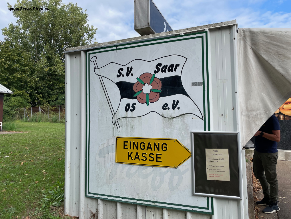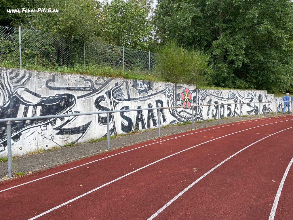 Der SV Saar 05 ist zweifelsohne ein Traditionsverein aus der saarländischen Landeshauptstadt, hat seine besten Tage allerdings lange hinter sich. 2001 kickte man zuletzt für ein Jahr in der damals viertklassigen Oberliga, danach immer nur in tieferen Ligen, Lokalmatador ist natürlich der 1. FC Saarbrücken, dessen Frauenmannschaft ebenfalls hier ihre Spiele austrägt und so sucht man so etwas wie Fankultur recht vergeblich, abgesehen von einer Handvoll Grundschüler, die hier sporadisch erste Schritte in Richtung „Support you local team“ unternehmen.