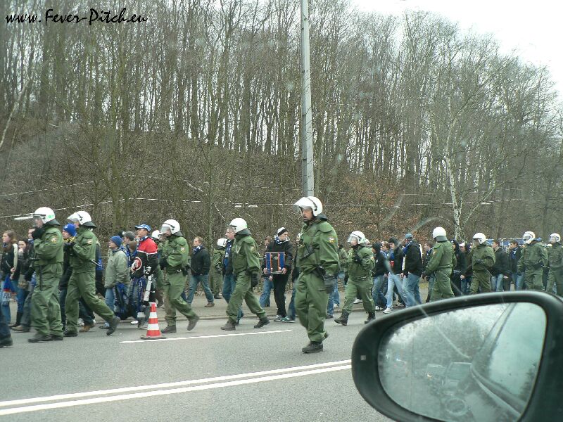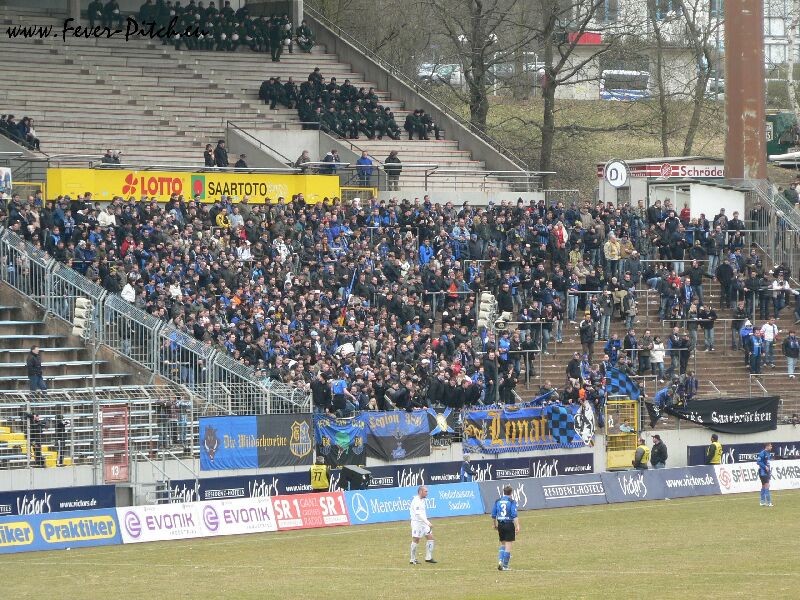 Der Jan holte mich also wie vereinbart um 8:00 Uhr von zuhause ab und von nun an stand faire Aufgabenteilung auf dem Zettel. Er stellte das Fahrzeug und ich lenkte es - abgesehen von einem kurzen Fahrerwechsel - ins Saarland und zurück. Ziemlich genau vier Stunden (ohne Staus und mit zügiger Fahrweise) benötigt man für die Strecke Meppen-Saarbrücken und somit zeitig angekommen. Stadion dank Navi auch sofort gefunden (irgendwie vermisse ich dieses planlose Herumkurven und Befragen dutzender Passanten von früher) und zunächst mal nach einem kostenneutralen Parkplatz Ausschau gehalten. Gleichzeitig kam der Mannheimer Zugfahrermob (ca. 300 Leute) von einem völlig irrsinnig übertriebenen Polizeiaufgebot begleitet am Stadion an. Blaulicht quasi bis zum Horizont und wohl kaum übertrieben, wenn man sagt, dass da auf jeden Mannheimer zwei Cops kamen.