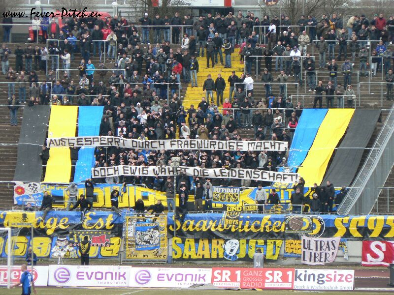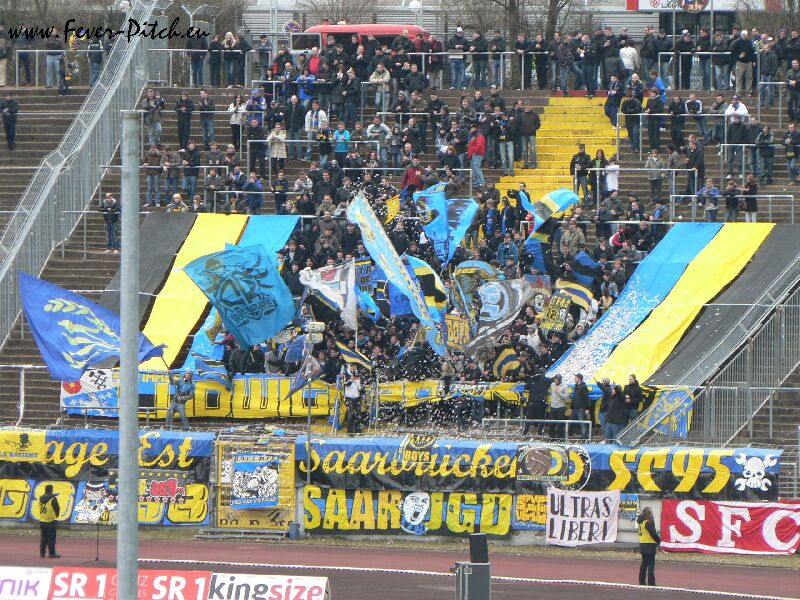 Dass man grundsätzlich die Seuche an den Füßen hat, wenn man einmal unten in der Tabelle steht mussten Mannheims Team und Anhang dann in der 90. Spielminute erfahren als tatsächlich noch Saarbrückens Lerandy den 2:1 Siegtreffer schießt und natürlich auf Heimseite fanatischer Jubel ausbricht und mir dabei ein wildfremder Zahnloser um den Hals fällt. Die mitgereisten Waldhöfer lassen nach kurzer Schockstarre ihren Frust noch etwas im Block an den Ordnern aus, ehe das Ganze mit reichlich Pfeffereinsatz beendet wird und wieder Ruhe einkehrt. Ansonsten auch generell nach dem Spiel alles ruhig und wir schnurstracks den Heimweg angetreten.