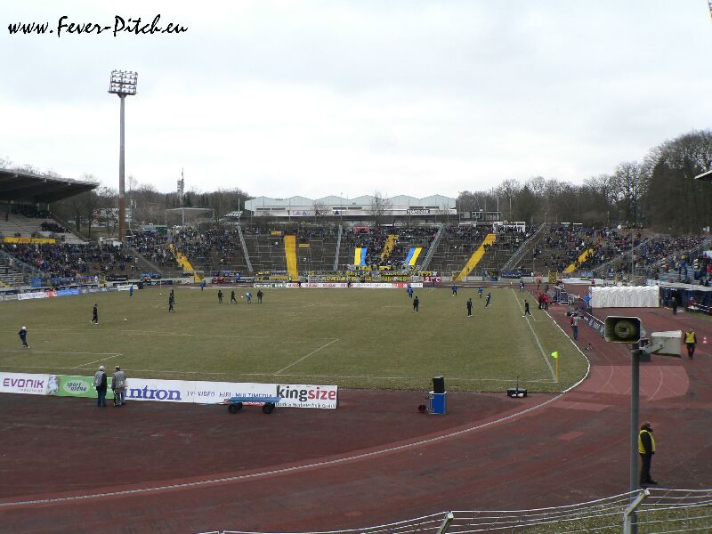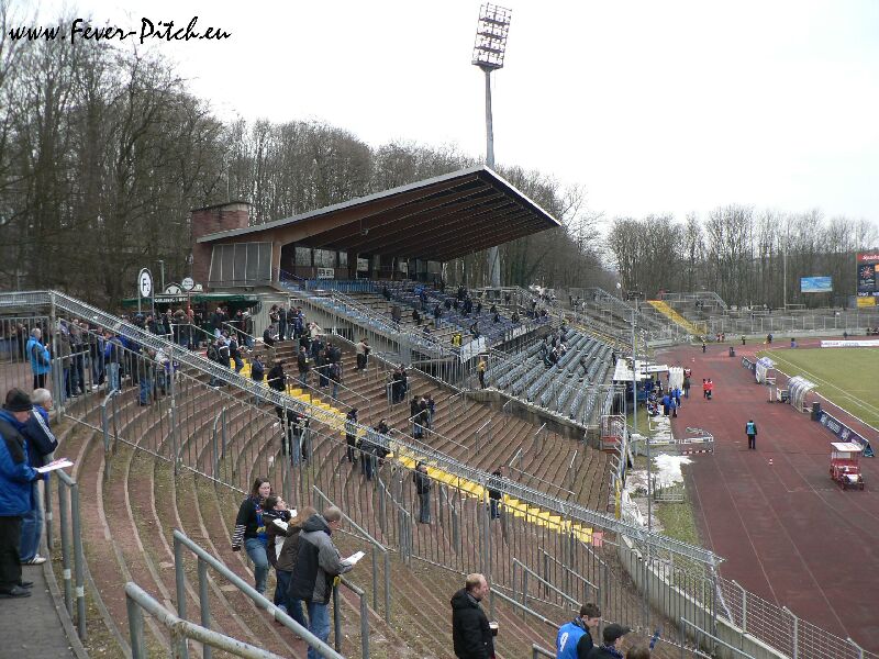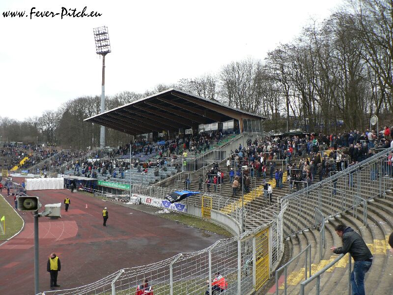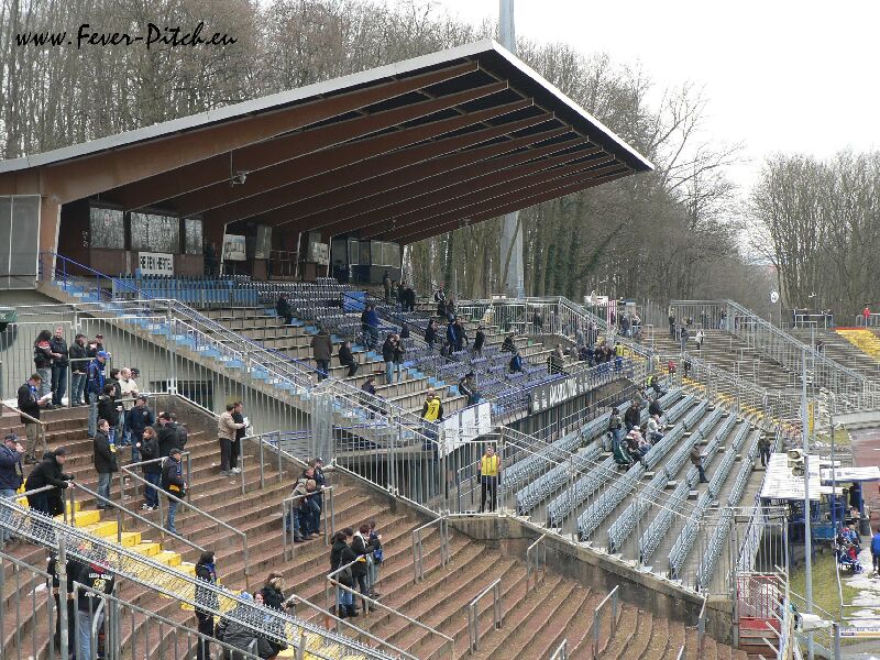 Sehen wir etwa so versoffen aus? Naja, den Weg zum Geldautomaten wusste er aber auch, sprach irgendwas von "bei der Kirche rechts" usw. Da ich aber nichteinmal die Kirche sah, wurde dieses Vorhaben abgebrochen und der Jan war so nett, mir die Eintrittskarte vorzufinanzieren. Zeit also, das Stadion zu betreten. Das Ludwigsparkstadion ist schon ein richtig geiles Ding mit seinen hohen Stehrängen und den beiden alten Tribünen. Trifft zumindest genau meinen Geschmack. Zudem kann man nach dem Kauf seiner Karte im halben Stadion herumlaufen und ist nicht irgendwo in einem Block gebunden. Bisschen schwach vielleicht der Zuschauerzuspruch hier beim Tabellenersten, knapp 5.500 sind nun nicht sinnbildlich dafür, dass man als Stadt und Region hinter seinem Team steht, zumal davon auch noch 700 aus Mannheim kamen. Diese waren vom Support her so ganz ordentlich ohne mich jetzt vollkommen zu verzücken, aber von der Lautstärke wars schon recht ok. Der aktive Teil der Saarbrücker Fanszene scheint gespalten bzw. jeweils sein eigenes Ding zu machen; da kommt wohl der französische Einfluss durch. Am Rande der einen Tribüne finden sich eher die traditionellen Anhänger, die mehr durch das Werfen irgendwelcher Gegenstände auf das Spielfeld auffielen während sich im angrenzenden Hintertorbereich Virage Est und Konsorten finden, die ganz klar die Ultraschiene fahren und unterstützt durch viele schöne Zaunfahnen, Fahnen, Doppelhalter, Bewegung im Block usw. ein ganz gutes Bild abgaben. Spielerisch wars von beiden Seiten eher Rumpelfußball, wobei insbesondere Saarbrücken in keiner Weise bewies, dass sie zu recht Tabellenführer sind. Außenseiter Mannheim erzielte sogar in der 38. Minute durch Bauder die Führung und rettete diese in die Pause, um sie auch anschließend bis zur 71. zu verteidigen als jedoch Saarbrücken der Anschlusstreffer gelang und auch das Spiel nun etwas an Fahrt aufnahm.