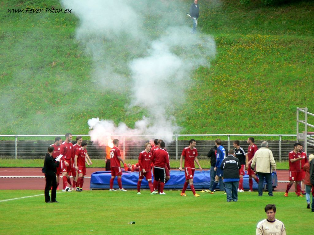 Naja, jedenfalls war heute recht gut was los hier. War man nicht einer der zahlreich vorhandenen neutralen Besucher (Groundhopper?), so waren sie Sympathien für beide Teams in etwa gleich verteilt, allerdings mit leichten Vorteilen auf Seiten der schwarz-weißen Wickeder. In einem recht unterhaltsamen Spiel fanden diese aber kein rechtes Mittel, um durch die vierbeinige Abwehr des Gegners den Ball ins Tor zu bugsieren, wurden teilweise ausgekontert und verspielten so in einem im Ergebnis vielleicht ein bis zwei Tore zu hoch ausgefallenen Spiel den Traum vom Aufstieg. Des einen Leid ist dann aber des anderen Freude und so feierte Schermbeck den Aufstieg stilecht mit einem brennenden Bengalo auf einer Hochsprungmatte. Wenn grad kein Balkon in der Nähe ist, dann halt so :-))