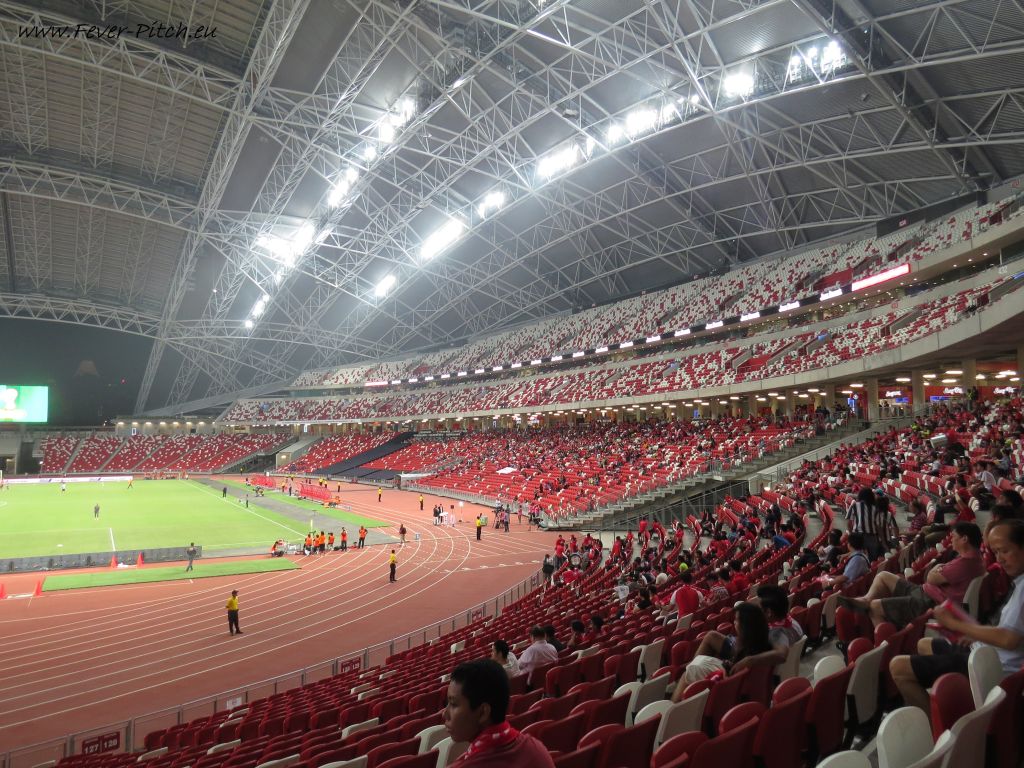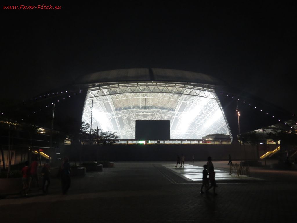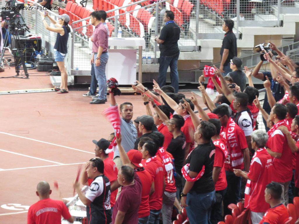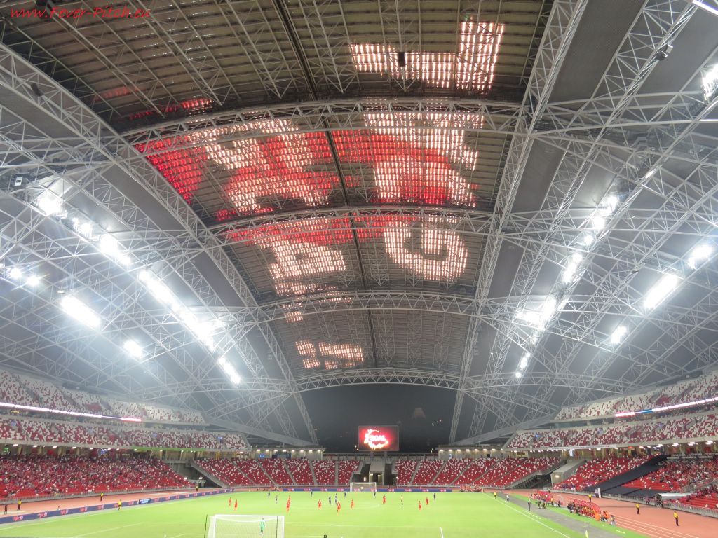 Im heutigen Spiel, zu dem jeder Besucher noch einen schicken rotweißen „Singapore“-Schal in die Hand gedrückt bekam, war schnell klar, dass beide Länder nicht zur weltweiten Fußballelite gehören. Zwar war bei Singapur teilweise so etwas wie eine reife Spielanlage zu erkennen, während der Gegner eher die hohe Kunst des Bolzens bevorzugte, aber insgesamt natürlich harte Kost für einen Fußballschöngeist wie mich. Die offiziellen 7.413 Zuschauer sind übrigens dreist gelogen und haben mich beim Wettspiel gegen meine Freundin ein Bier gekostet (ich 4.200, sie 4.700). Maximal 5.000 waren da, eher weniger, dafür aber immerhin ein kleines Grüppchen schräg hinterm Tor, das um Support bemüht war das mit Gesang und wirklich guten Trommelrhythmen auch für die geringe Anzahl gut hinbekam.