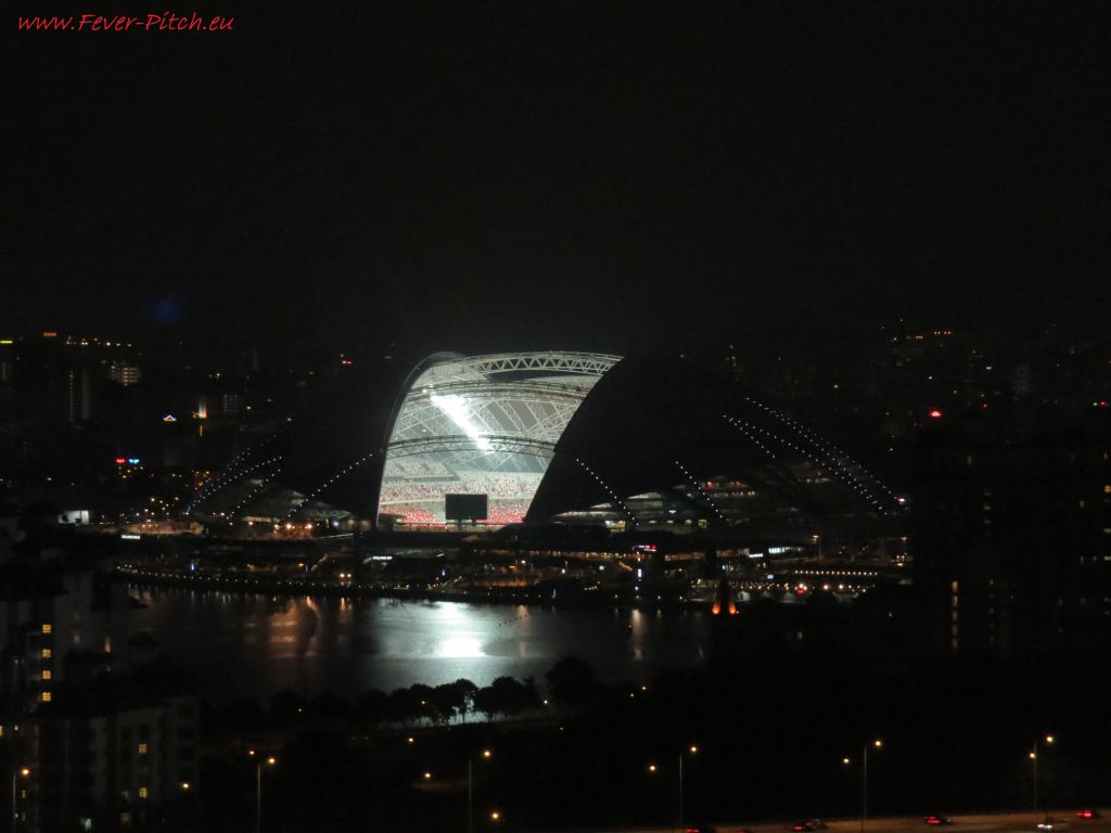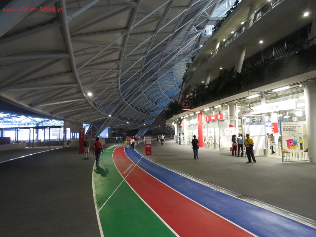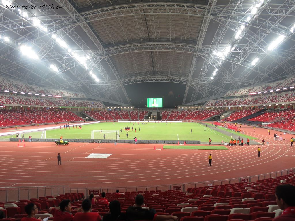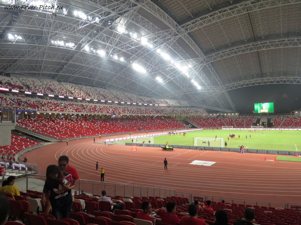 Im heutigen Spiel, zu dem jeder Besucher noch einen schicken rotweißen „Singapore“-Schal in die Hand gedrückt bekam, war schnell klar, dass beide Länder nicht zur weltweiten Fußballelite gehören. Zwar war bei Singapur teilweise so etwas wie eine reife Spielanlage zu erkennen, während der Gegner eher die hohe Kunst des Bolzens bevorzugte, aber insgesamt natürlich harte Kost für einen Fußballschöngeist wie mich. Die offiziellen 7.413 Zuschauer sind übrigens dreist gelogen und haben mich beim Wettspiel gegen meine Freundin ein Bier gekostet (ich 4.200, sie 4.700). Maximal 5.000 waren da, eher weniger, dafür aber immerhin ein kleines Grüppchen schräg hinterm Tor, das um Support bemüht war das mit Gesang und wirklich guten Trommelrhythmen auch für die geringe Anzahl gut hinbekam.