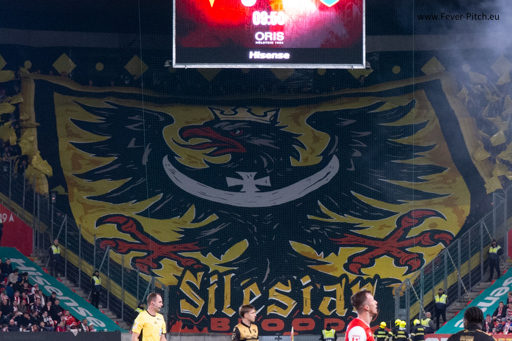 Katowice. Man besinnt sich anhand eines „Silesian Blood“-Banners im unteren