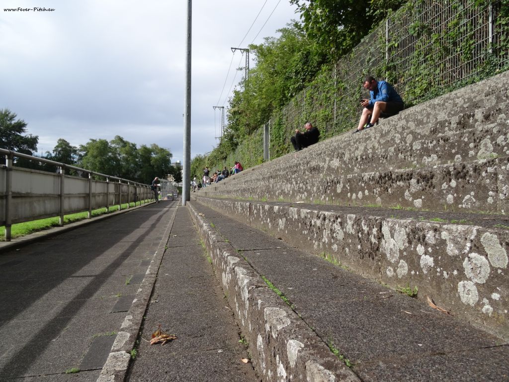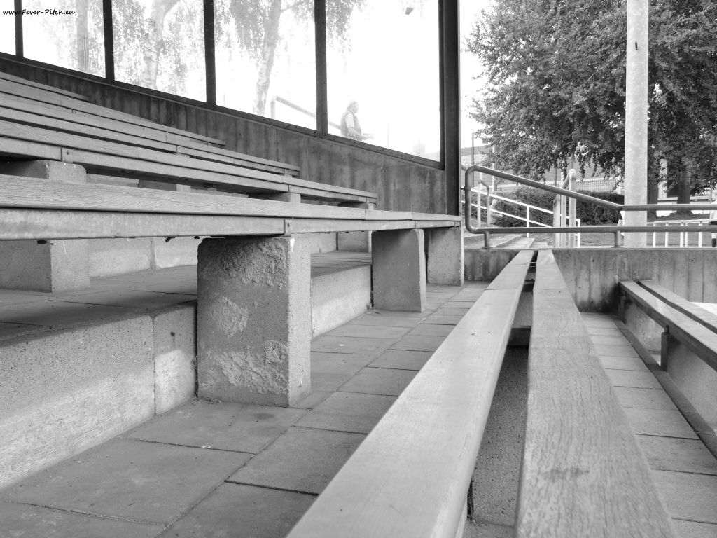 überdachte Sitzplatztribüne mit Holzbänken, auf der Gegenseite paar Stufen und Graswälle