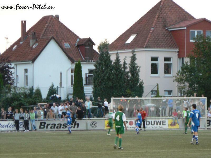 Reichlich früh in der Huntestadt angekommen, wurde zunächst dem Vereinsheim ein Besuch abgestattet, in dem bereits Rapunzel mit schwerem Reiserucksack saß, so kam er doch gerade vom Länderspieltrip der DFB-Auswahl aus Baku. Hier noch schnell ein Bier genossen ging es dann auch in den Gästebereich, wenig später traf auch die Busfahrercrew (zwei Busse) ein und es konnte unter gestrengen Blicken der BFE losgehen. Unser Team, von dem rund ein Drittel in der letzten Saison ja noch für den Gastgeber kickte, legte sofort gut los und erzielte den beruhigenden Führungstreffer.