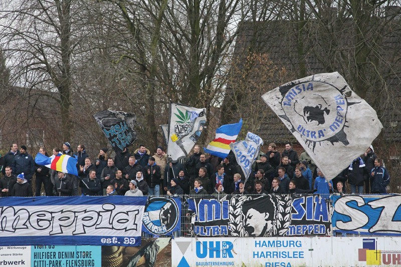 etwa 15 Mann starke Abordnung der Ultras Flensburg als Empfangskomitee bereit