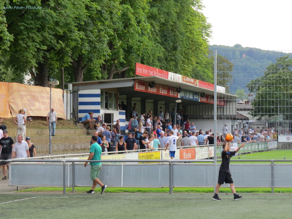 Bierbänken im Schatten mit freier Sicht aufs Spielfeld saß. Sehr genial, wäre
